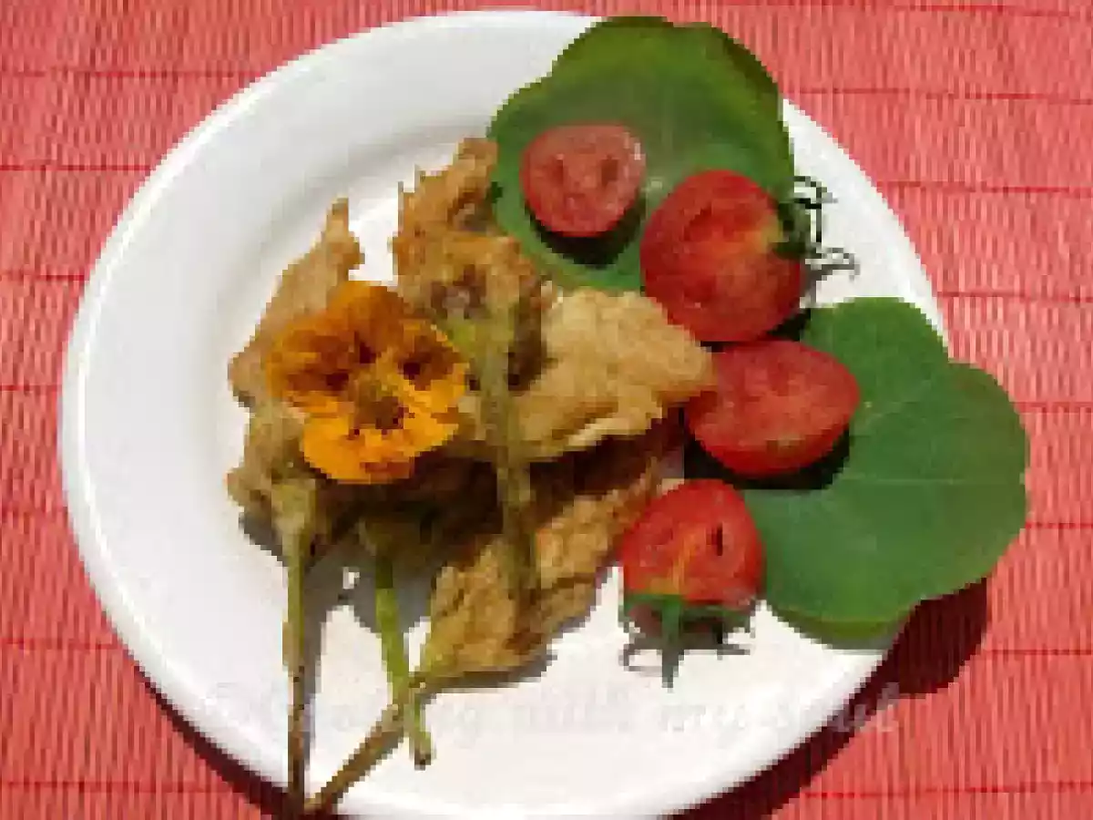 Flori de dovlecel umplute cu mozzarella si ansoa (stuffed zucchini blossoms) Felul principalFoarte ușor45 min Trimite unui prieten Printează pagina Adresează o întrebare autorului Postează o poză cu rețeta gătită de tine Ingrediente 4 14 flori de dovlecel proaspete 14 bucatele mici de mozzarella 14 fileuri de ansoa (din conserva) 100 ml ulei pentru prajit Pentru pane: 1 ou, batut bine 100 ml apa de la gheata 3 linguri faina 1/2 lingurita piper