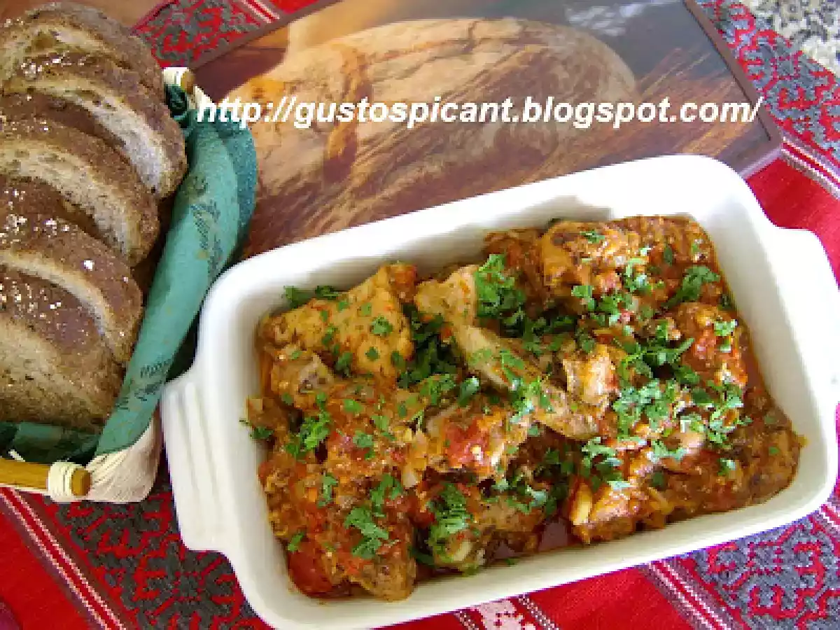 Mâncare de pui cu vinete fripte Felul principalFoarte ușor45 min Trimite unui prieten Printează pagina Adresează o întrebare autorului Postează o poză cu rețeta gătită de tine Ingrediente 5 ½ pui, tiat în buci; 2 vinete mari; 1 pahar roii pasate; 3-4 linguri past de ardei; 4-5 cei de usturoi curai; 1 ceap curat; 3 linguri ulei de floarea soarelui; ½ linguri rozmarin tocat; ½ linguri boia dulce; ½ linguri cimbru; un vârf de cuit de scorioar mcinat; un vârf de cuit de nucoar; ½ linguri piper negru; sare dup gust.