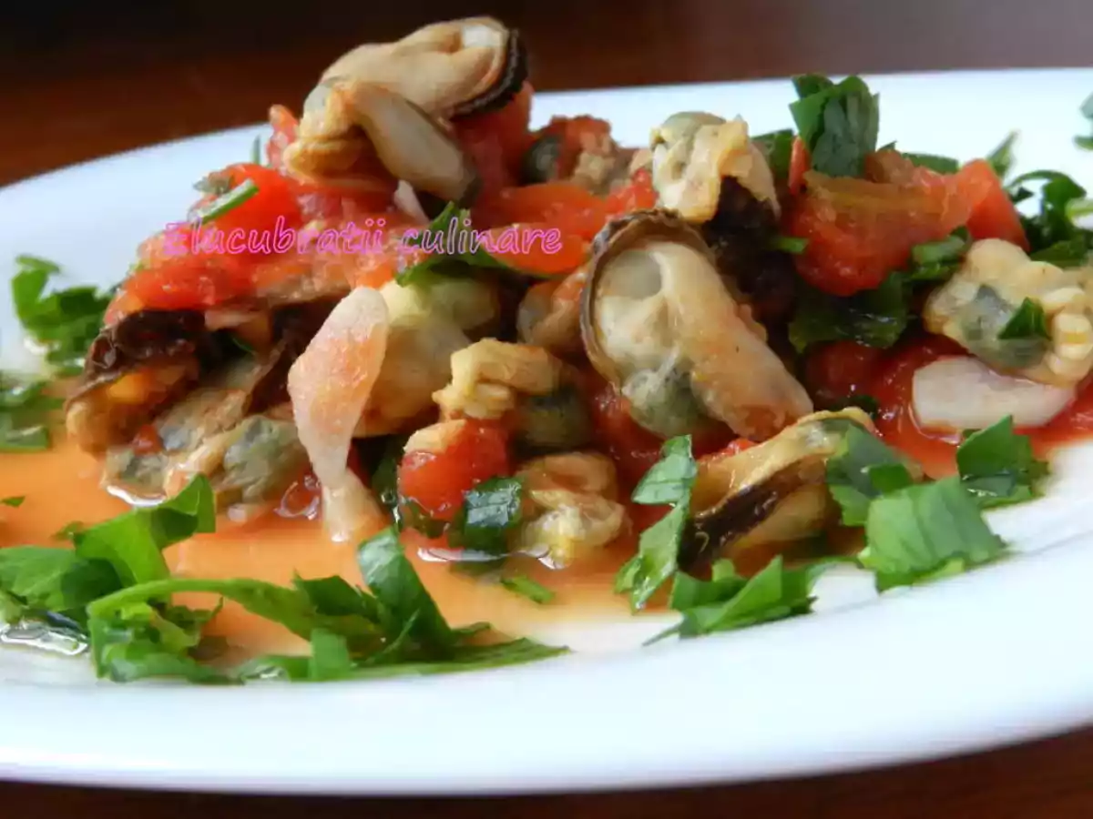 Midii în sos provensal Felul principalFoarte ușor30 min Trimite unui prieten Printează pagina Adresează o întrebare autorului Postează o poză cu rețeta gătită de tine Un pic din Franta Ingrediente 4 400 g midii curățate sau 1,5 kg cu tot cu scoică, 50 g unt, 1 căpățână usturoi, 1 conservă roșii tocate, 200 ml vin alb sec, 1 legătură mare de pătrunjel proaspăt, sare, piper.