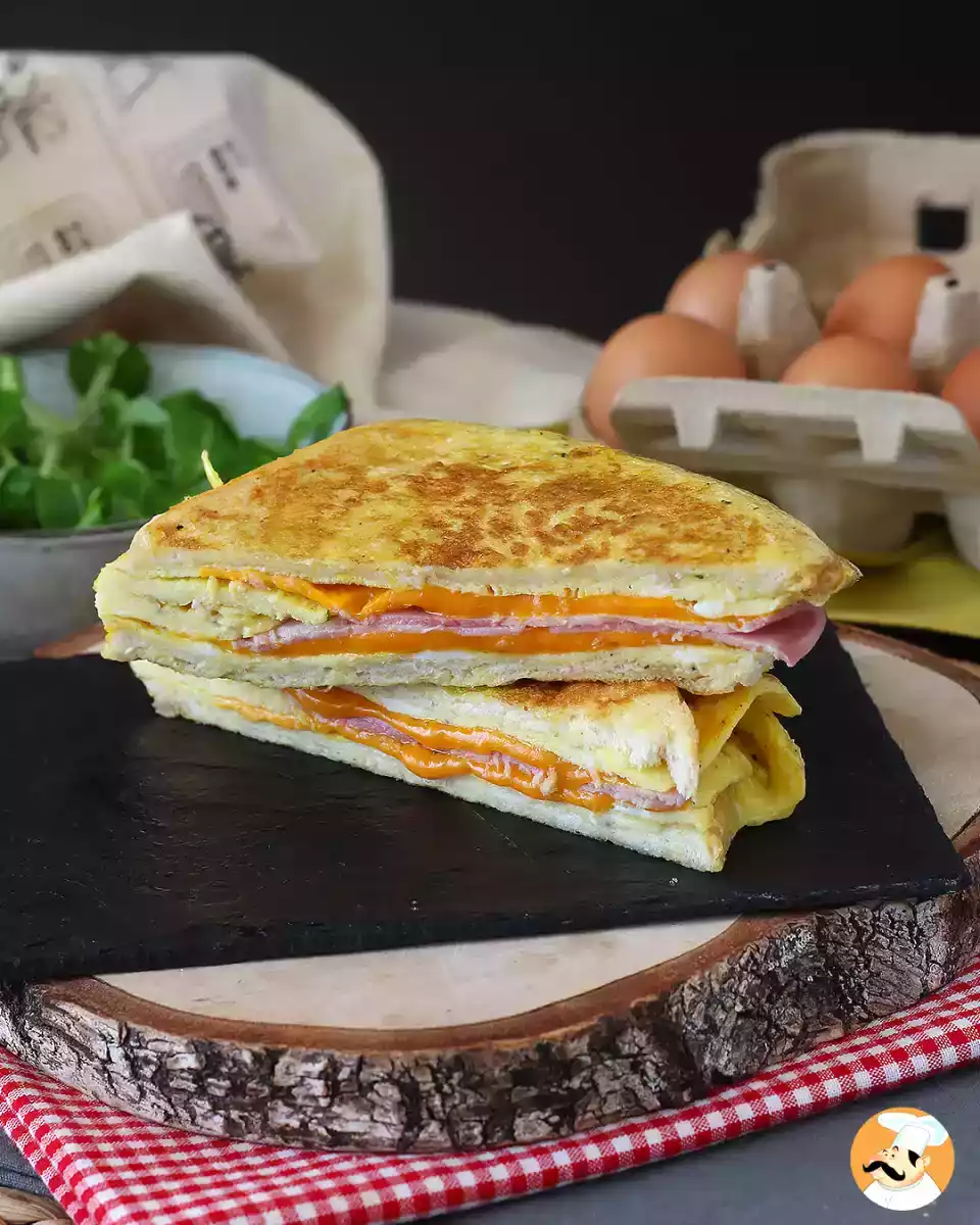 Sandwich-ul cu omletă (cunoscut și sub numele de Egg Sandwich Hack) este o rețetă rapidă și ușoară, perfectă pentru cei care caută o masă bogată în proteine. Datorită utilizării ouălor, care sunt o sursă excelentă de proteine de înaltă calitate, acest sandwich vă oferă energia de care aveți nevoie pentru a trece peste zi. Un amestec de aromă și nutriție care vă va ajuta să vă mențineți sătul și activ, ideal atât pentru un mic dejun, cât și pentru un prânz rapid și echilibrat.