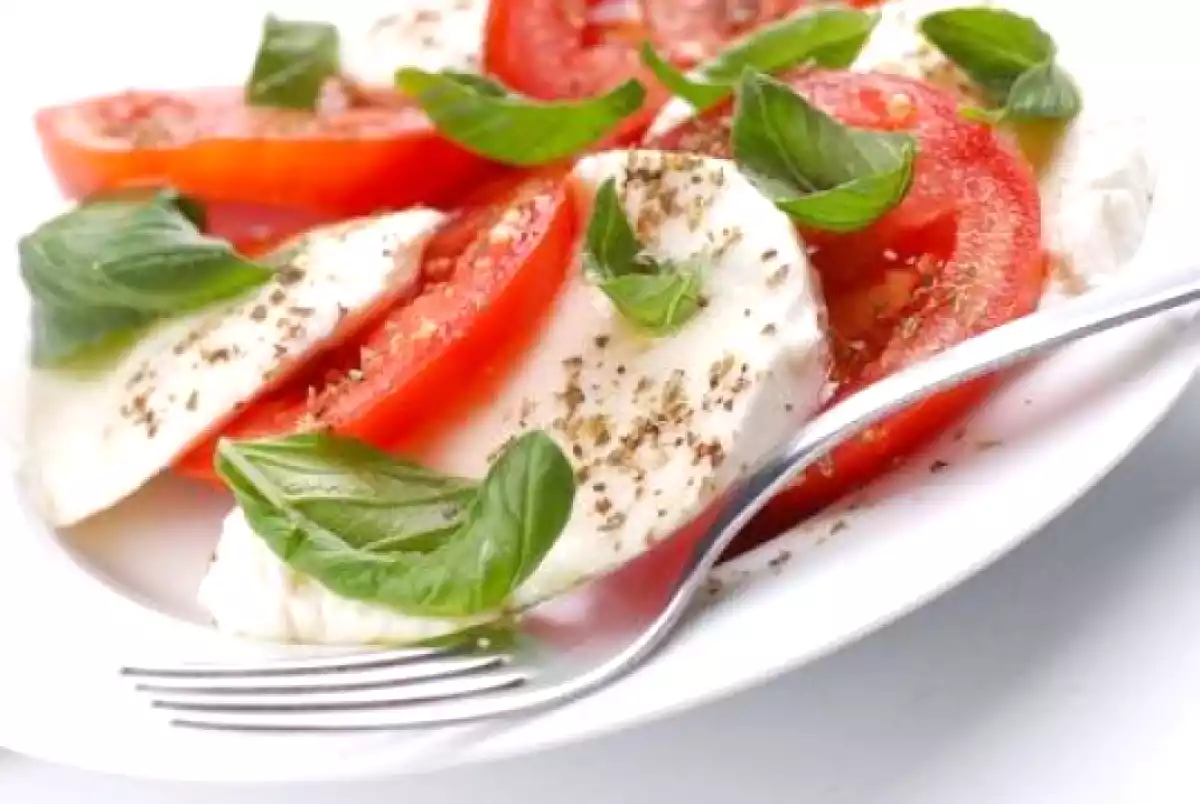 Salata Caprese se realizeaza din felii proaspete de mozzarella, rosii si busuioc, asezonate cu sare si ulei de masline.