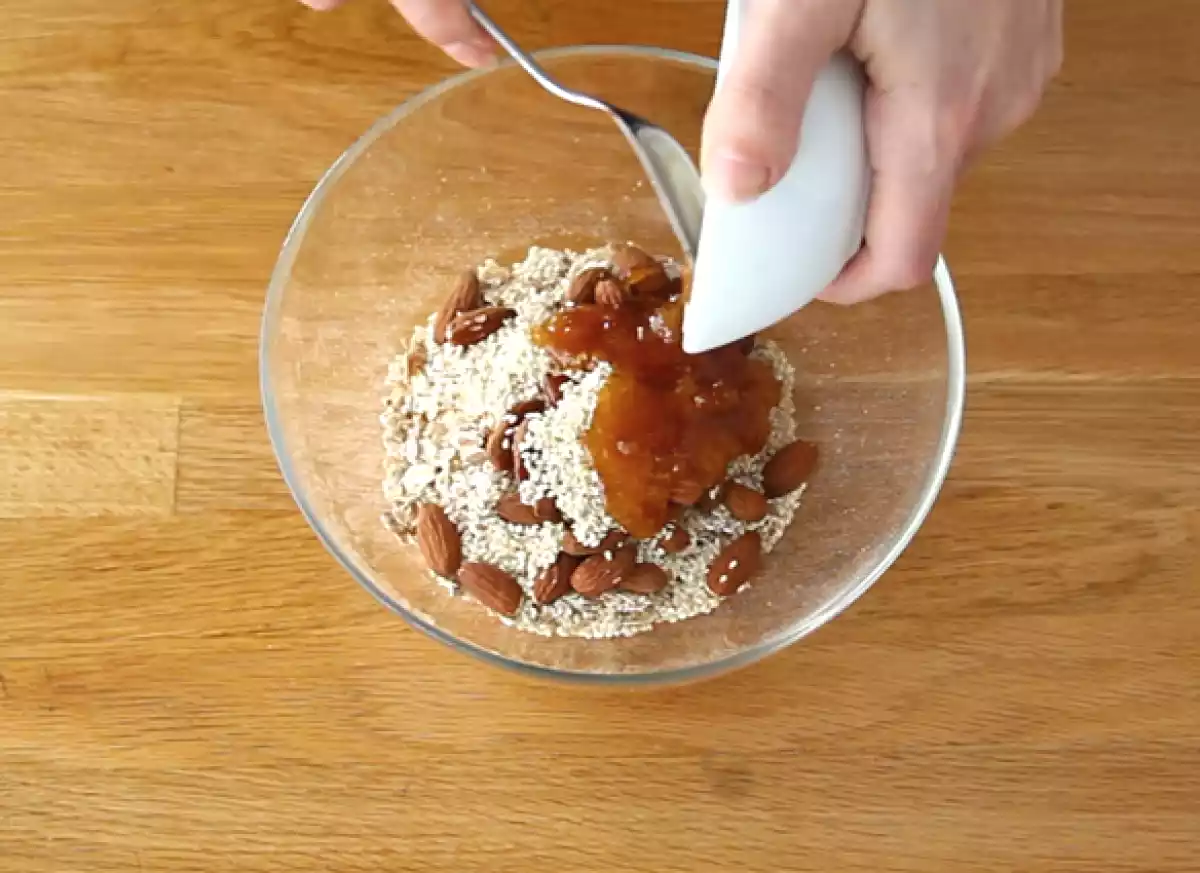 Adăugați uleiul de semințe și mierea la amestecul uscat. Amestecați bine până la omogenizare, asigurându-vă că toate ingredientele uscate sunt bine acoperite.