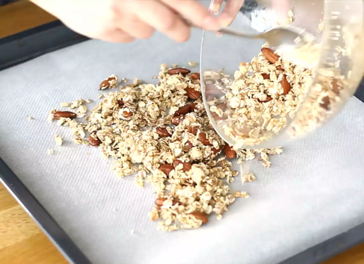 Preîncălziți cuptorul la 180°C și coaceți tava timp de aproximativ 12 minute. În timpul coacerii, este recomandabil să amestecați granola la jumătatea timpului pentru a asigura o rumenire uniformă.