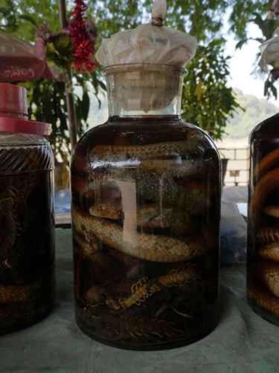 Nu exista niciun mister la aceasta bautura ciudata. Sticlele gigant contin vin de orez sau alcool de cereale, soparle, serpi, scorpioni sau alte taratoare infioratoare. Otrava acestora a fost anihilata, in procesul de fabricare al vinului. In schimb, licoarea este considerata sanatoasa si este benefica sanatatii.