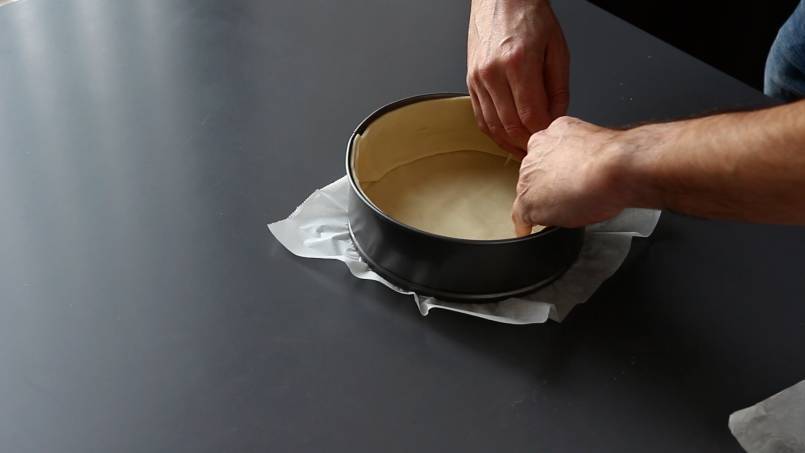 Așezați baza de foitaj: Tăiați un disc de foitaj de aceeași dimensiune ca fundul formei de copt și așezați-l cu grijă în interior.