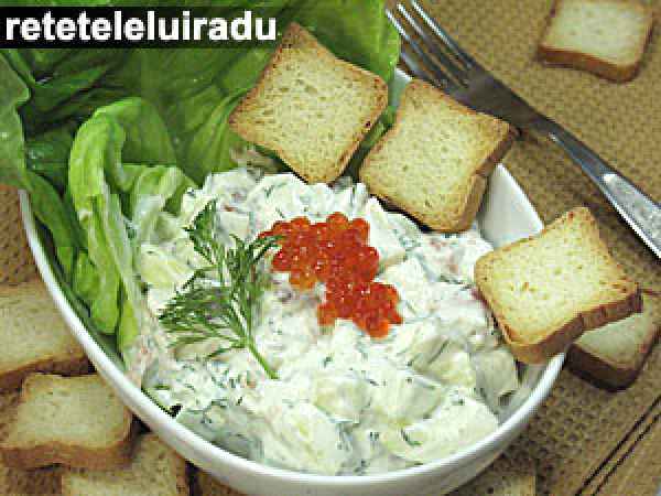 Intr-un iaurt simplu adaugati castraveti tocati si marar sau frunze tocate de menta, usturoi si ardei rosu. Serviti aceasta salata racoritoare ca atare sau o puteti folosi alaturi de pui sau carne de miel la gratar.