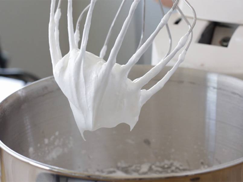 Se bat albușurile cu 50 g zahăr. Când bătătorul lasă urme vizibile, adăugați restul de 50 g zahăr. Continuați să lucrați amestecul până când acesta are o consistență lucioasă, spumoasă.