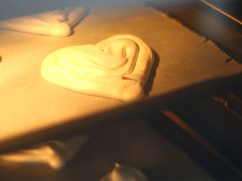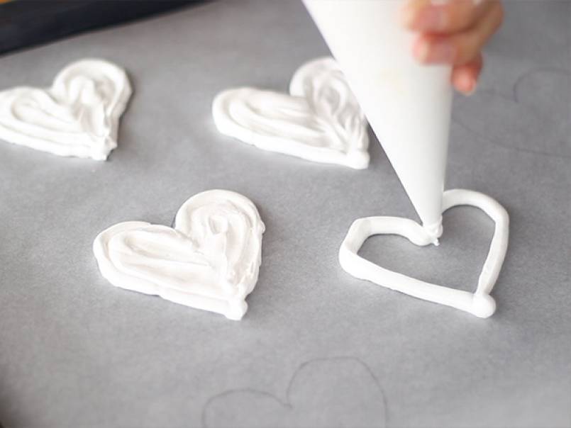 Se desenează inimioare pe hârtia de copt. Apoi, se umple o pungă cu meringue și se formează inimioare urmând liniile desenate.
