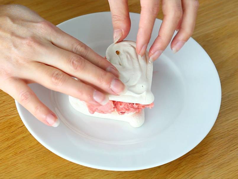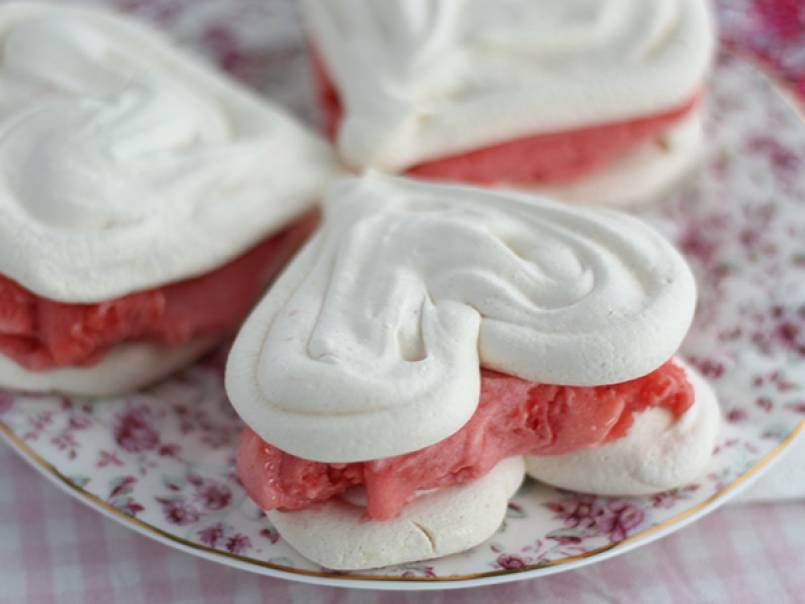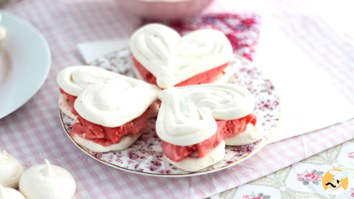 După ce meringele s-au răcit, procedați la asamblare: așezați o inimă de meringue ca bază, adăugați înghețată de căpșuni deasupra, apoi așezați o altă inimă de meringue deasupra și apăsați ușor (fără a deteriora meringue-ul).