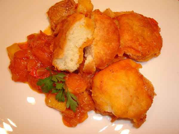 Tocanita de porc cu legume si painici pufoase.