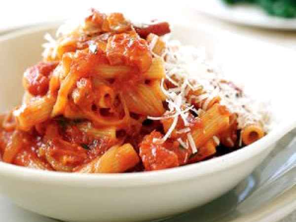 Paste cu bacon, sos de rosii si busuioc