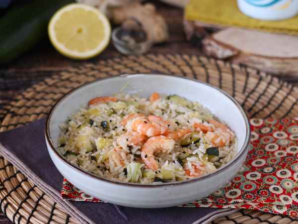 Salată de orez cu creveți, dovlecel și ghimbir