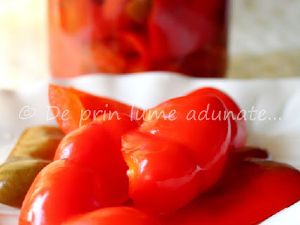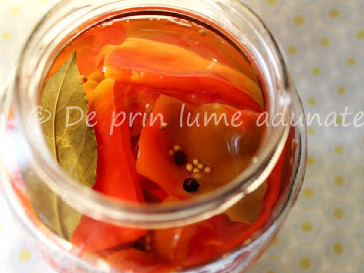 Ardei (gogosari) marinati la borcan PrecedentulUrmătorul AlteleFoarte ușor10 min Trimite unui prieten Printează pagina Adresează o întrebare autorului Postează o poză cu rețeta gătită de tine Ingrediente 4 ardei otet de vin alb sare zahar foi de dafin seminte de mustar boabe de piper