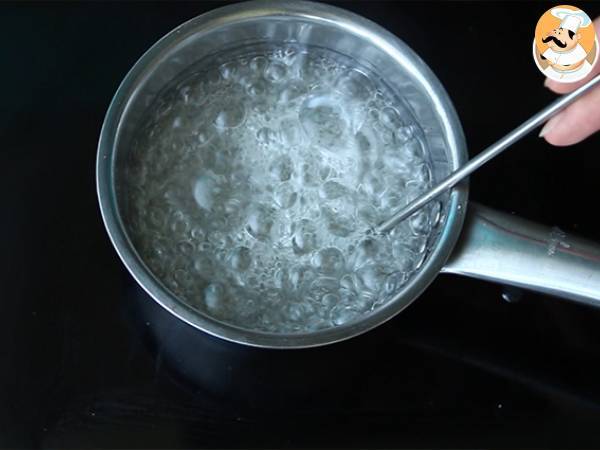 Puneti zaharul si apa intr-o cratita si aduceti la fierbere. Odata ce amestecul incepe sa fierba, puneti termometrul: acest sirop trebuie sa ajunga la 115° C.