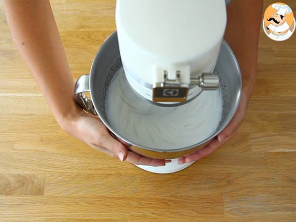 In timp ce siropul se incalzeste, incepeti sa bateti albusurile de ou: acestea trebuie sa fie batute spuma. Odata ce siropul a atins 115° C se toarna in fir subtire peste albus in timp de mixerul bate.