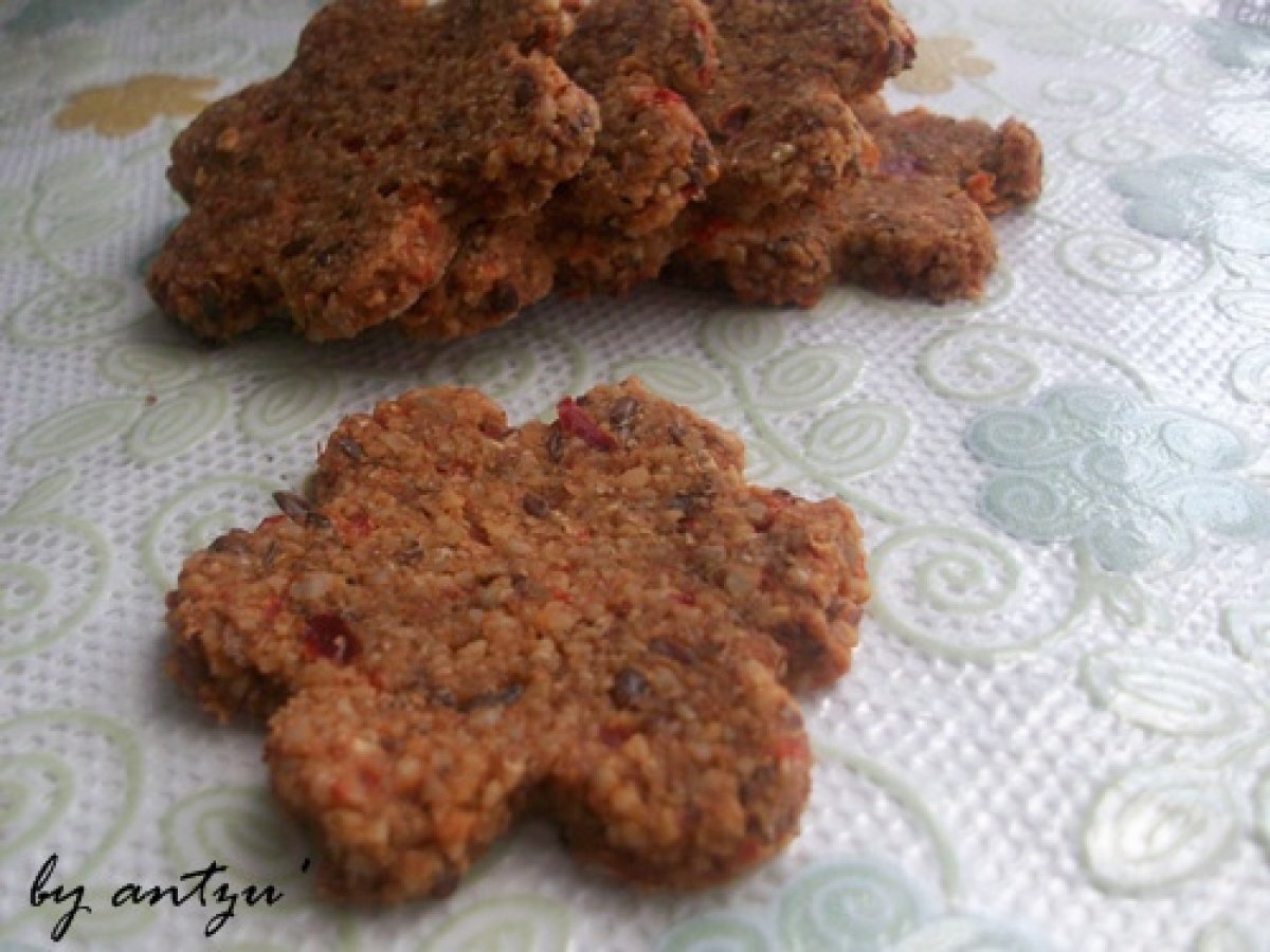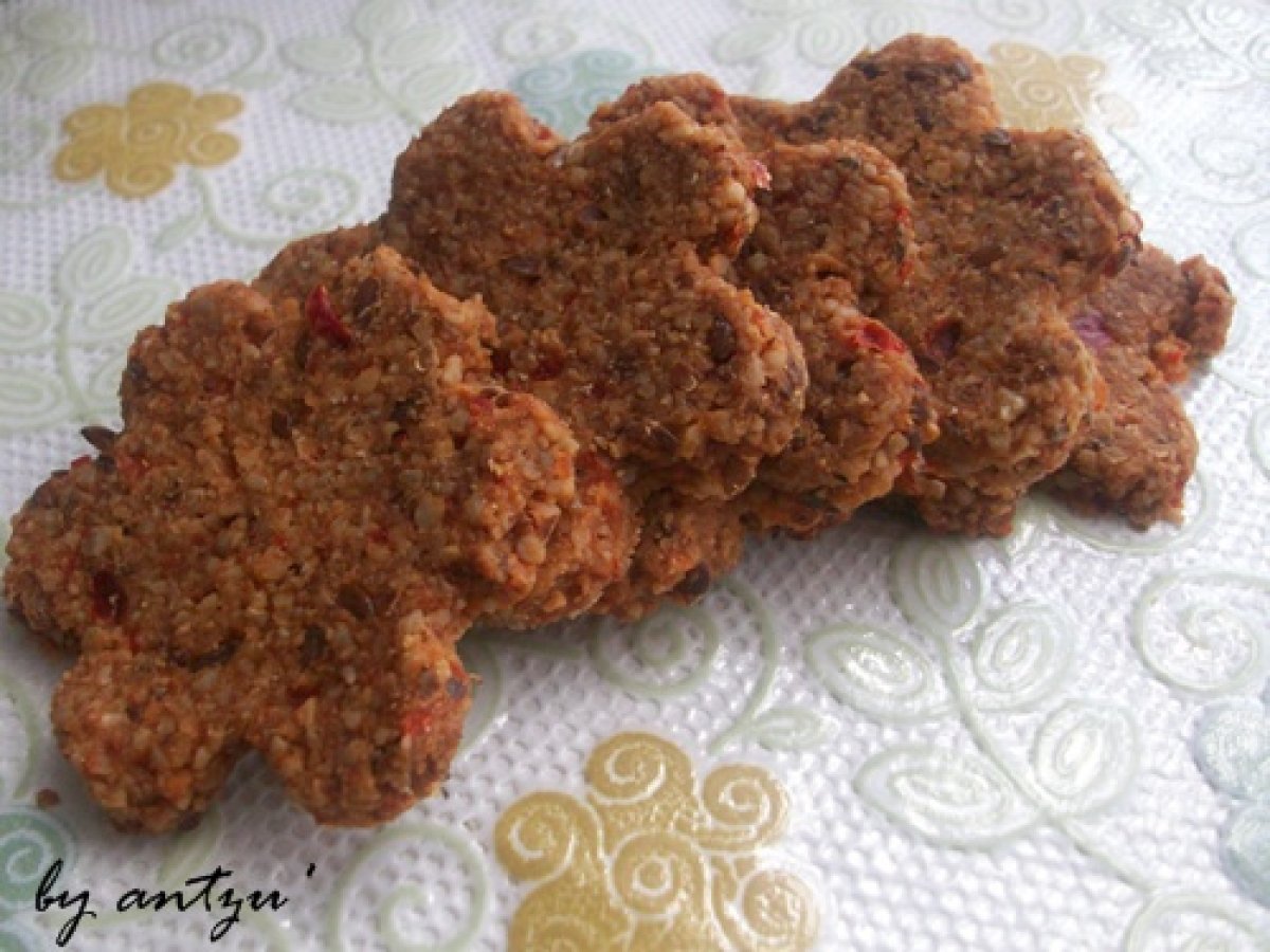 Biscuiti din legume votează acum PrecedentulUrmătorul AlteleFoarte ușor35 min Trimite unui prieten Printează pagina Adresează o întrebare autorului Postează o poză cu rețeta gătită de tine Ingrediente 4 jum cana seminte de floarea soarelui jum cana migdale jum cana nuci braziliene jum de ardel mare rosu gras 1/4 seminte de in zdrobite 1 lingurita rasa de boia iute de ardei 1 lingurita rasa de boia dulce de ardei sare dupa gust 2 linguri fulgi de drojdie