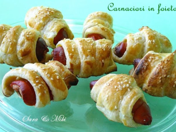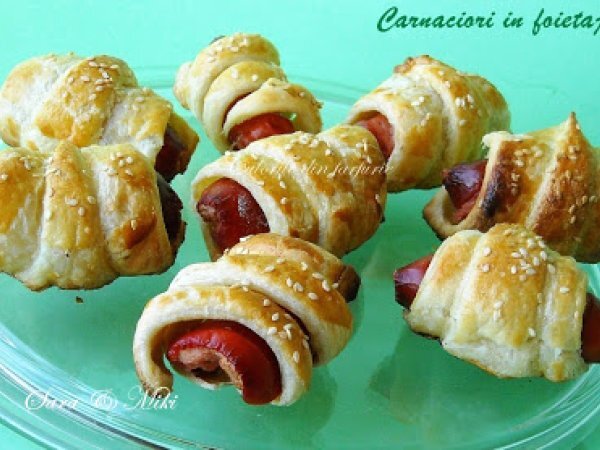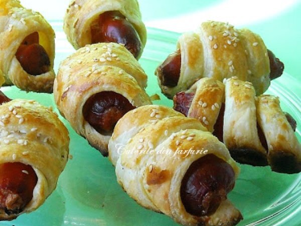 Carnaciori in foietaj PrecedentulUrmătorul AlteleFoarte ușor35 min Trimite unui prieten Printează pagina Adresează o întrebare autorului Postează o poză cu rețeta gătită de tine Ingrediente 4 1 pachet de foietaj - 400 g 250 g carnati mici 1 ou batut susan sare