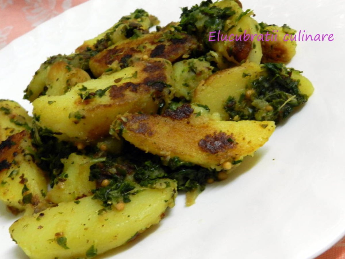 Cartofi zdrobiți cu spanac AlteleFoarte ușor55 min Trimite unui prieten Printează pagina Adresează o întrebare autorului Postează o poză cu rețeta gătită de tine Condimentati Ingrediente 4 1 kg cartofi, 450 g spanac, 3+1 linguri ulei de măsline, 1/2 linguriță boabe de muștar, 1 linguriță chimen măcinat, 1/4 linguriță boia iute, 2 căței de usturoi, 1 linguriță ghimbir proaspăt ras, zeama de la 1/2 lămâie, sare, piper proaspăt măcinat.
