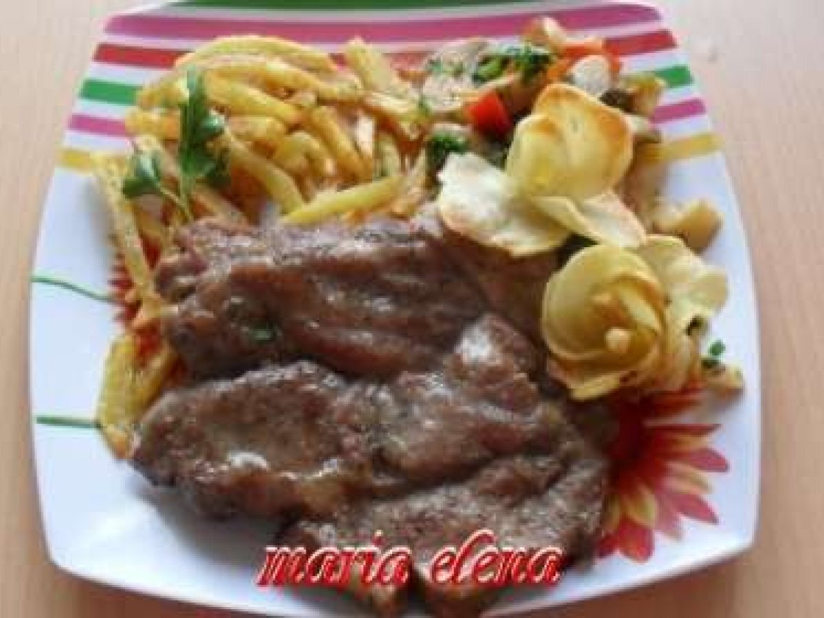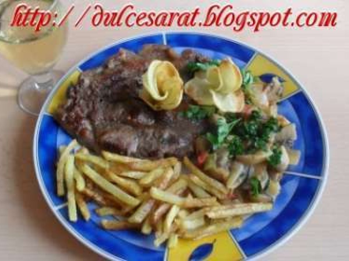 Ceafa de porc cu garnitura de ciuperci si cartofi PrecedentulUrmătorul AlteleUșor Trimite unui prieten Printează pagina Adresează o întrebare autorului Postează o poză cu rețeta gătită de tine Ingrediente 8 Ceafa de porc, 1/2 ciuperci pt gratar, 2 cepe vechi, 3 fire de cepa verde, 6 rosioare cherry, sare, piper, patrunjel verde, 4 cartofi, ulei, cubulete de ardei gras rosu (din congelator).