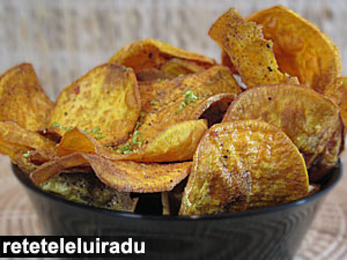 Chipsuri de cartofi dulci AlteleFoarte ușor15 min Trimite unui prieten Printează pagina Adresează o întrebare autorului Postează o poză cu rețeta gătită de tine Ingrediente 4 2 cartofi dulci, circa 400 g in total ulei, pentru prajit 1 lingurita de ienibahar, macinat 1 lingurita de sare 2 ardei iuti, uscati