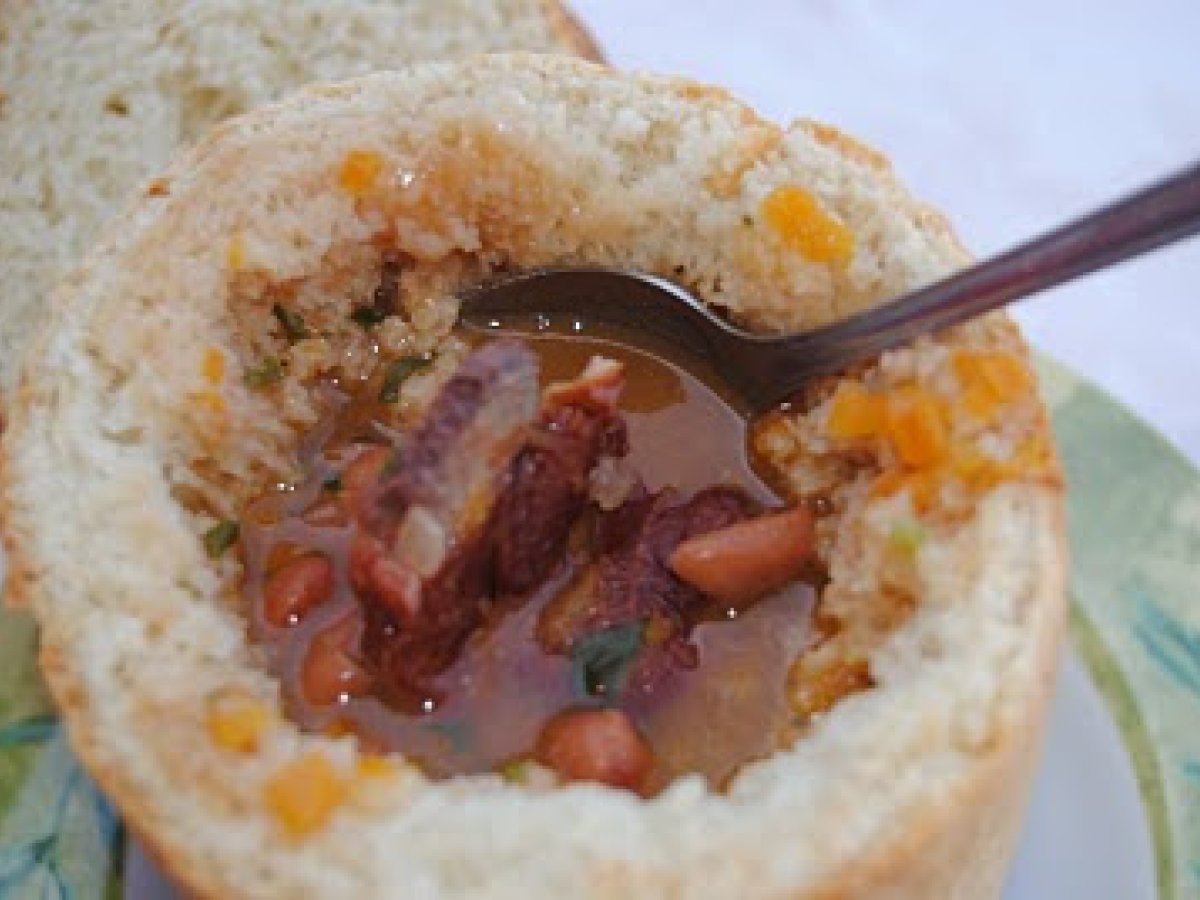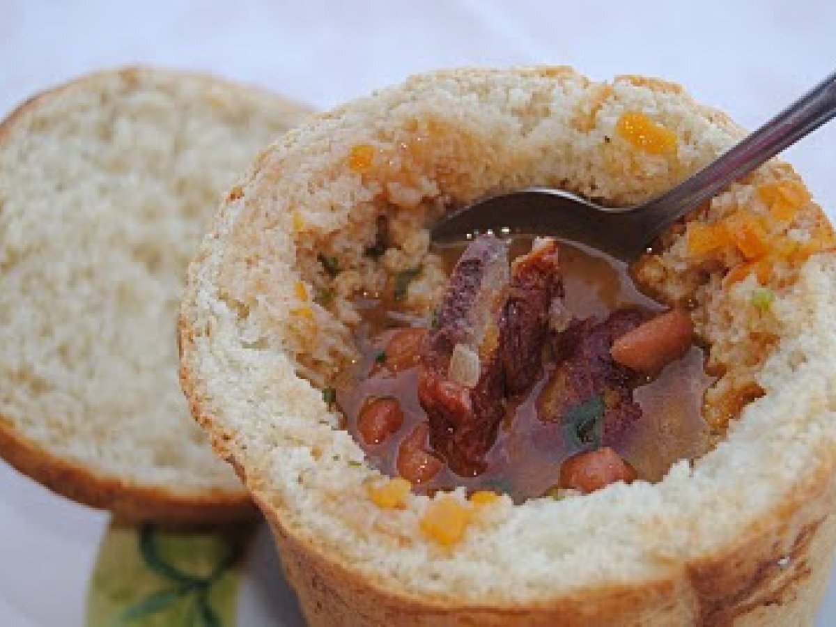 Ciorba de fasole in paine PrecedentulUrmătorul AlteleFoarte ușor35 min Trimite unui prieten Printează pagina Adresează o întrebare autorului Postează o poză cu rețeta gătită de tine Ingrediente 4 1 kg faina 60 g drojdie proaspata sau 4 plicuri dorijdie uscata 440 g apa 2 linguri ulei 1 lingurita zahar 2 lingurit rase de sare 500 g fasole 1 ciolan afumat sau costita afumata 2 morcovi 1/2 praz 1 ceapa telina sare, piper 1 cub vegeta 1 ardeu 50 g bacon afumat 1 lingura ulei 1 lingurita boia patrunjel smantana pentru servit 5 l apa aprox