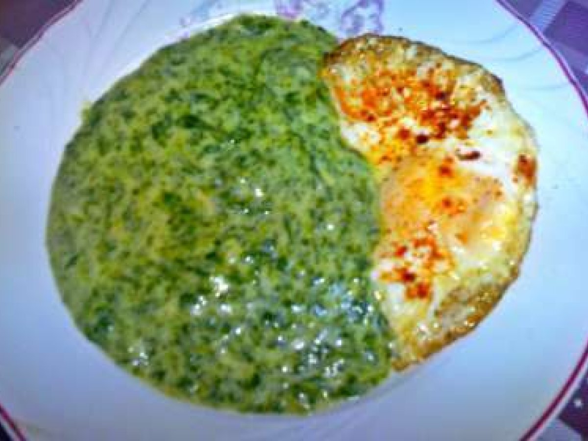 Crema de spanac cu ou AlteleUșor1 h 10 m Trimite unui prieten Printează pagina Adresează o întrebare autorului Postează o poză cu rețeta gătită de tine Ingrediente 4 INGREDIENTE:1kg.de spanac ,3lg.smantana,3lg.faina,300ml.de lapte,1lg.de unt,piper,boia vegeta