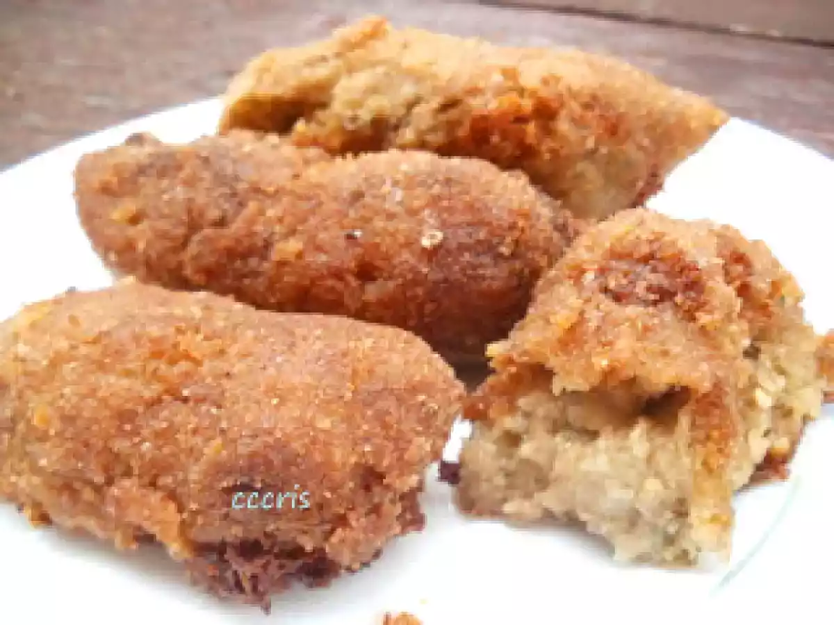 Crochete cu vinete AlteleFoarte ușor30 min Trimite unui prieten Printează pagina Adresează o întrebare autorului Postează o poză cu rețeta gătită de tine Ingrediente 4 1 kg de vinete 2 cups brinza rasa 1 ou 1 lingurita patrunjel 1 lingurita de ceapa tocata fin 1 1/2 lingurita praf de copt 1 cup pesmet Crusta oua pesmet