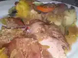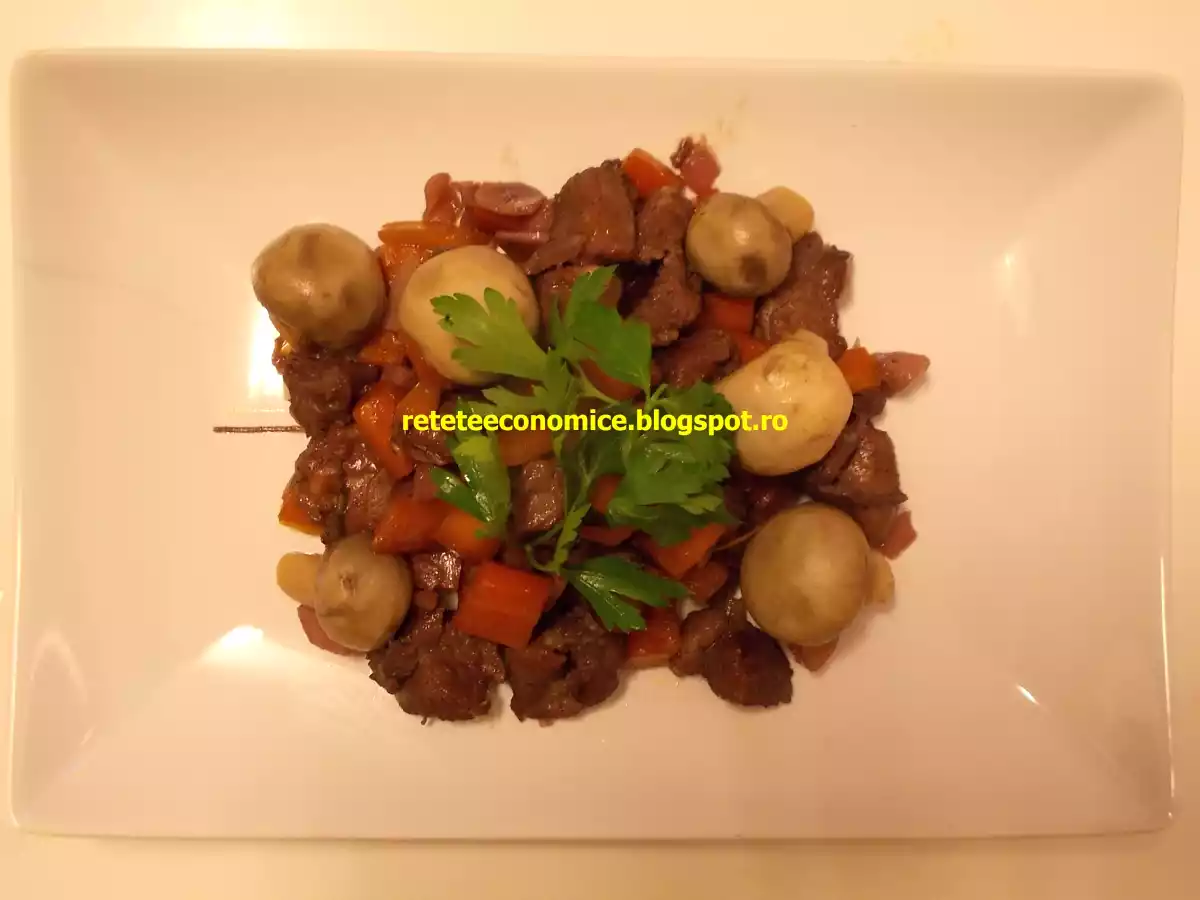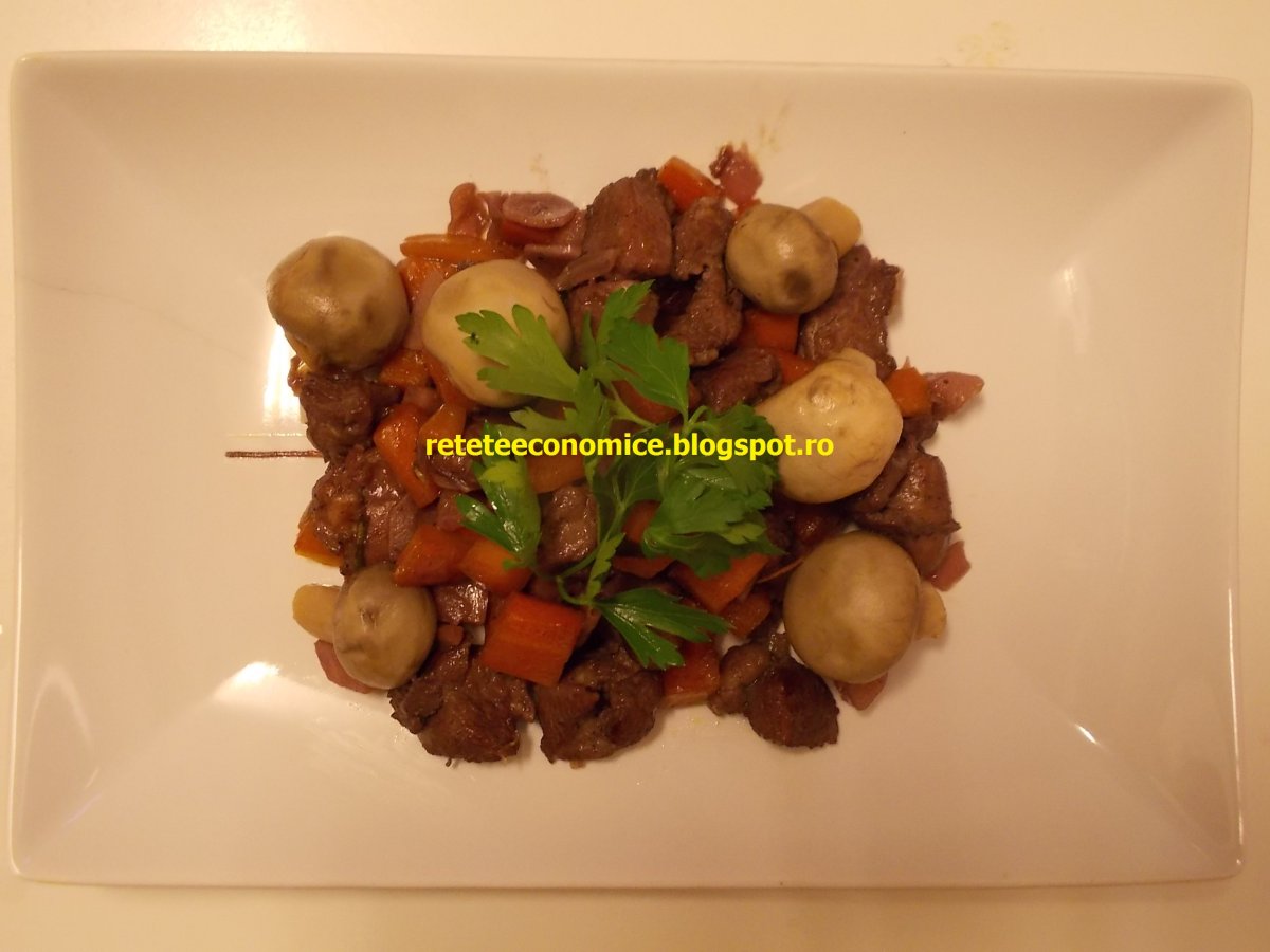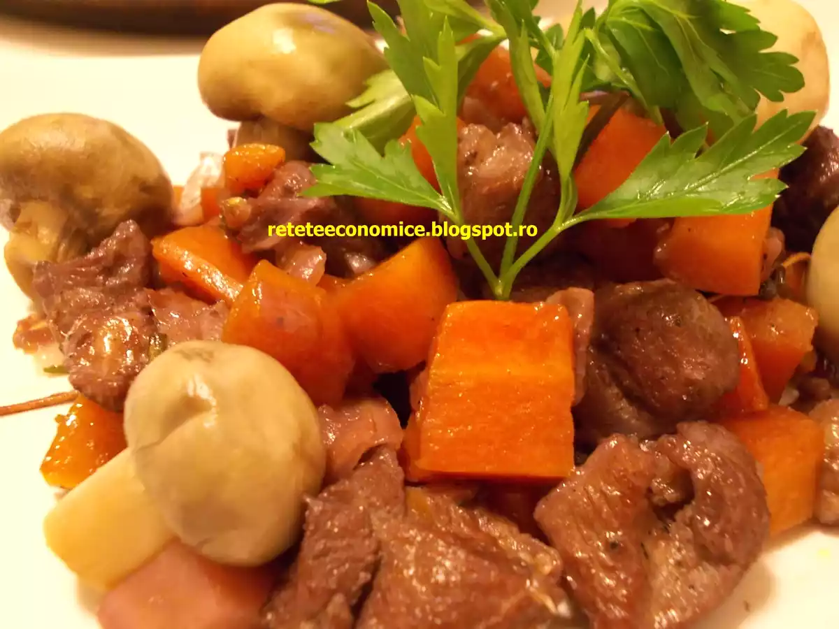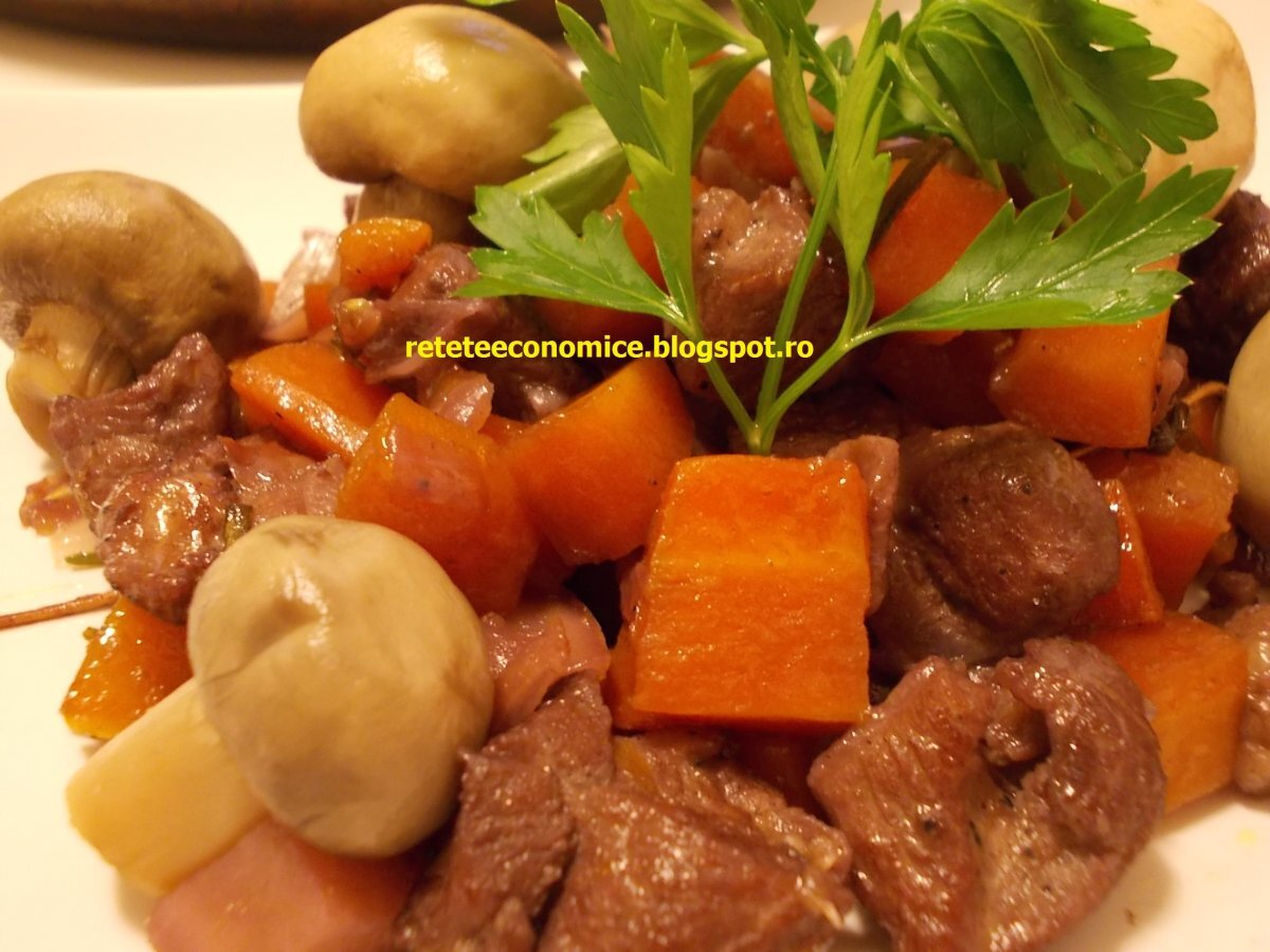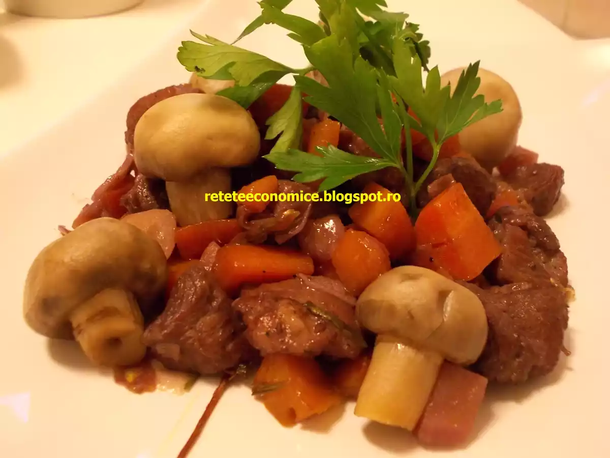 Curcan in vin rosu cu legume si ciuperci PrecedentulUrmătorul AlteleUșor1 oră Trimite unui prieten Printează pagina Adresează o întrebare autorului Postează o poză cu rețeta gătită de tine O reteta cu adevarat buna Ingrediente 3 500g pulpe de curcan dezosate (500-600 g ; se poate folosi si cu os) O ceapa alba mare 3 morcovi medii 5 bucatele usturoi O radacina patrunjel Doua cani vin rosu demisec Doua crengute cimbru (sau uscat) O crenguta rozmarin (sau uscat) 2 linguri ulei de floarea soarelui (2-3) Sare Piper