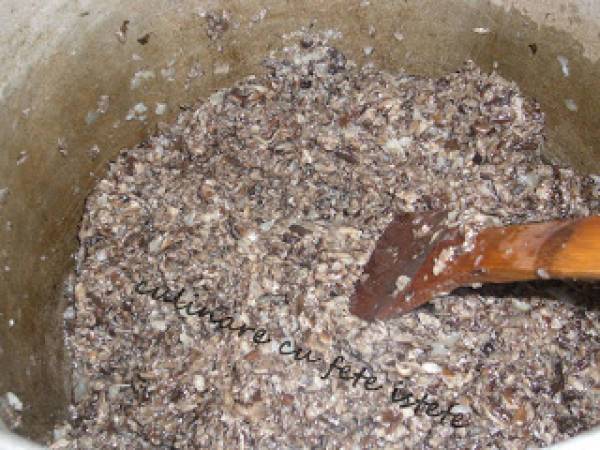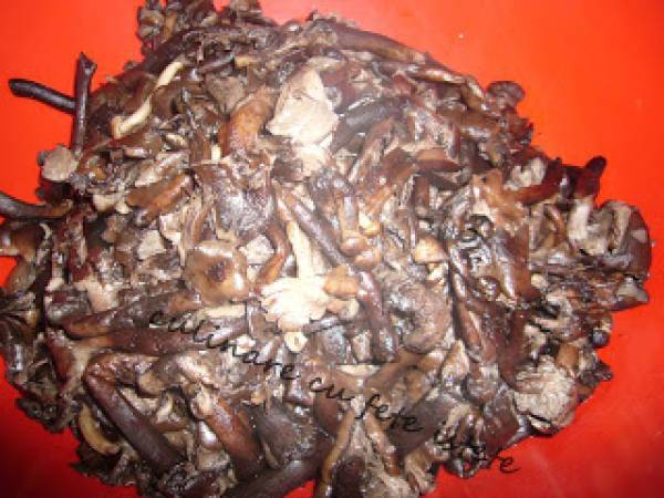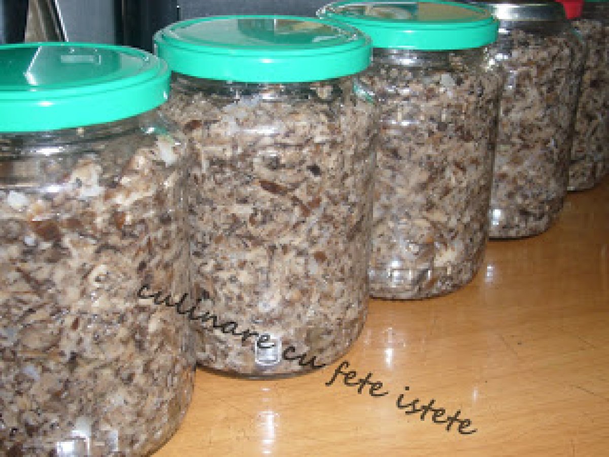 Cand s-a inmuiat ceapa punem ghebele tocate, completam cu sare si piper dupa gust, lasand la prajit. Pregatim borcanele sterilizate in prealabil, ( de 800 gr), le umplem cu ghebele prajite si dam la cuptor pentru 25 min.