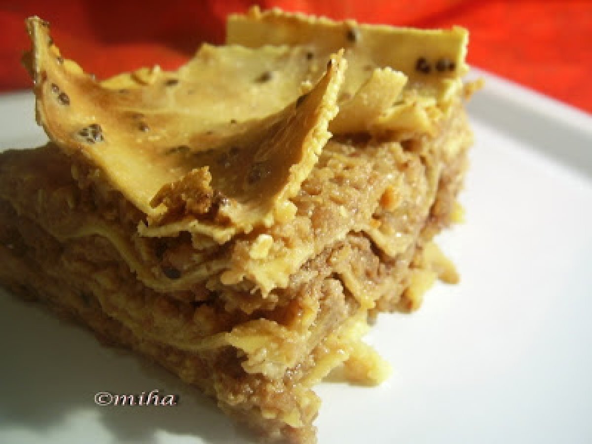 Lasagna cu mere si nuci PrecedentulUrmătorul AlteleFoarte ușor20 min Trimite unui prieten Printează pagina Adresează o întrebare autorului Postează o poză cu rețeta gătită de tine Ingrediente 2 8 foi de lasagna Pentru umplutura : 2 mere mari 2 linguri zahar 1 lingurita scortisoara 100 g nuca macinata 1 lingura unt bilute de ciocolata Pentru sos : 240 ml apa 100 g unt 150 g zahar 10 linguri lapte praf