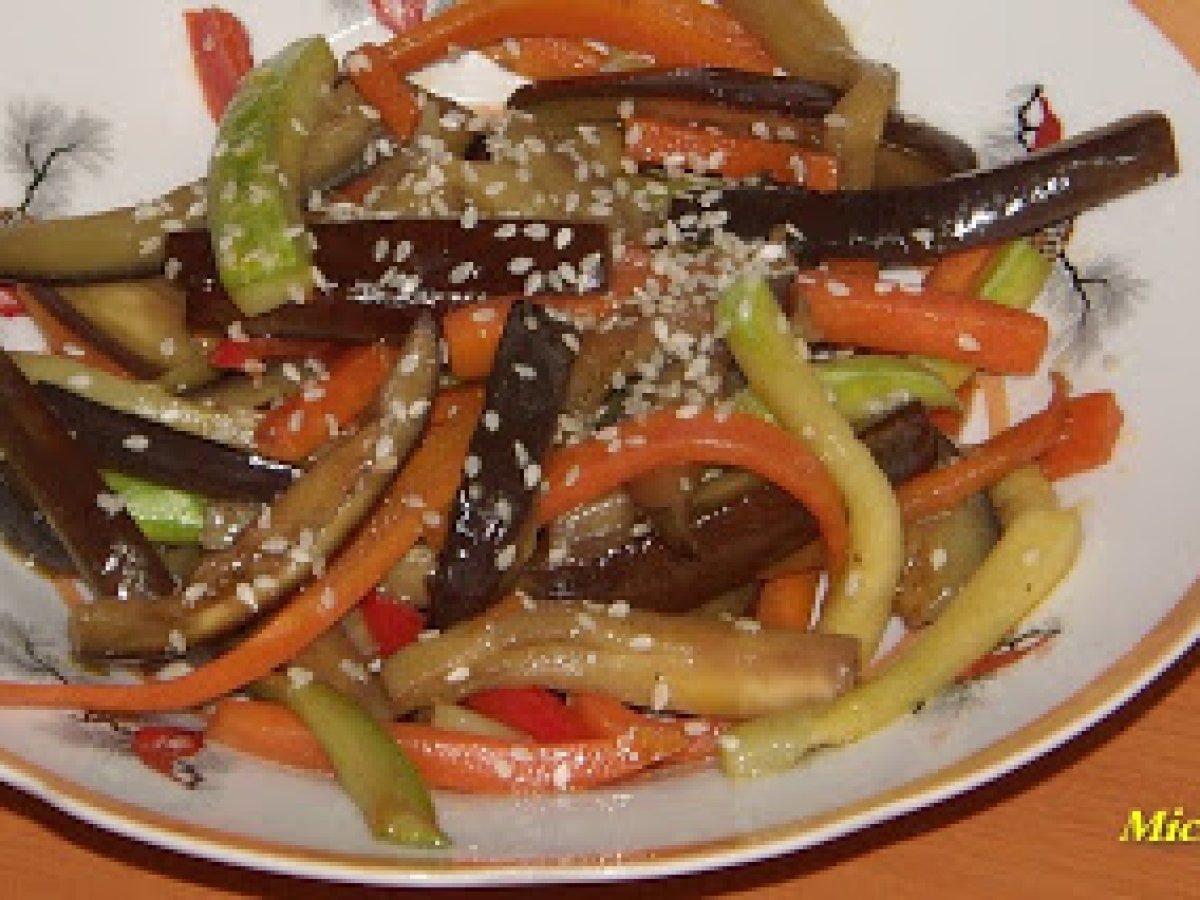 Legume la tigaie AlteleFoarte ușor40 min Trimite unui prieten Printează pagina Adresează o întrebare autorului Postează o poză cu rețeta gătită de tine Ingrediente 4 2 morcovi, 1 dovlecel, 1 vanata, 1 ardei gras rosu, 1 ardei gras verde, 3 linguri ulei de masline, 1 lingurita seminte de susan, 3 lingurite sos worcestershire, sare, piper.