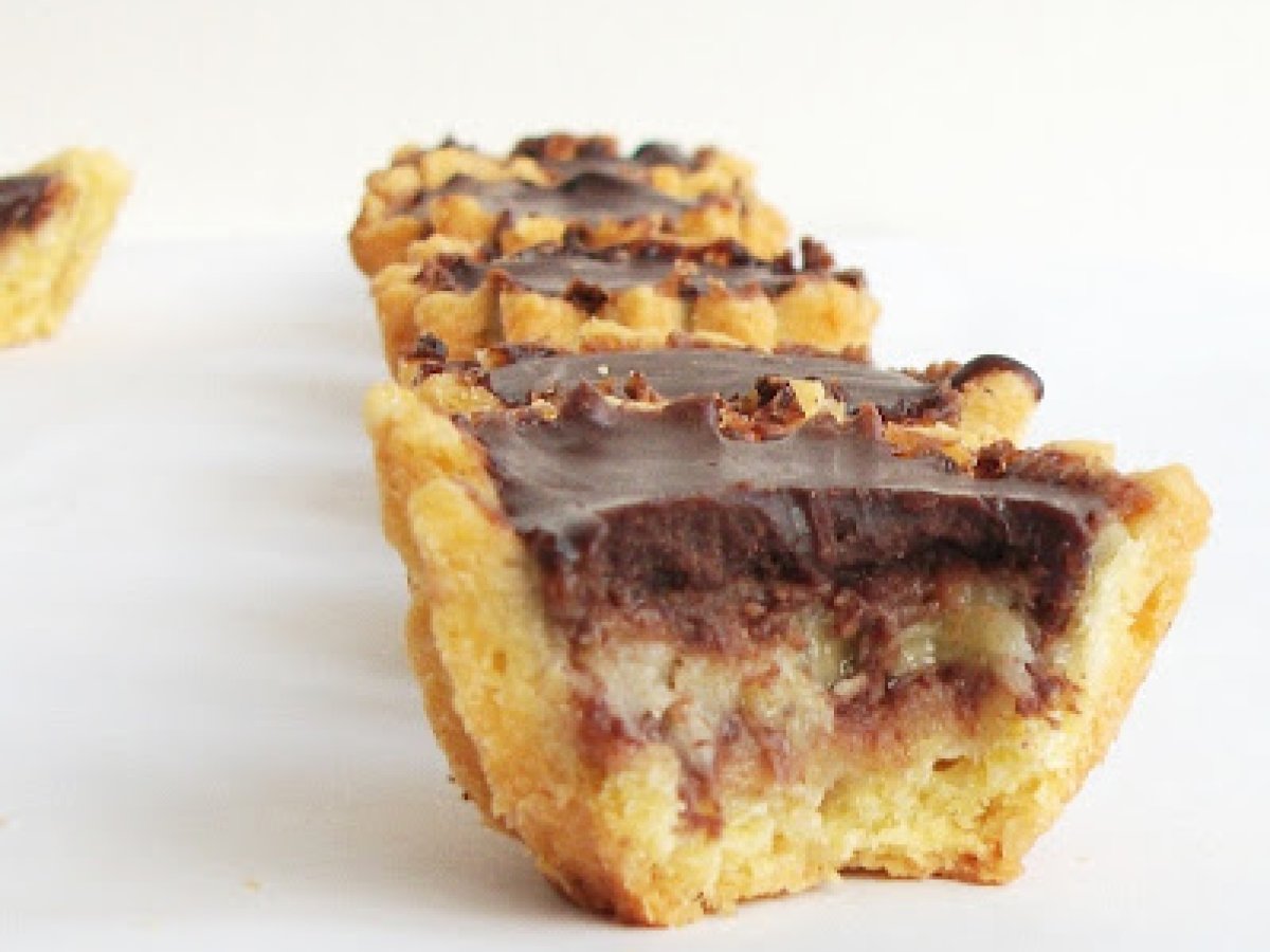 Mini-tarte cu banane si ciocolata PrecedentulUrmătorul AlteleFoarte ușor35 min Trimite unui prieten Printează pagina Adresează o întrebare autorului Postează o poză cu rețeta gătită de tine Ingrediente 4 aluat tarta: 400 g fin 120 g alune nesarate si neprajite 200 g unt 8 linguri de zahr 2 oua 1/4 lingurita praf de copt crema de ciocolata: 150 g ciocolata 1 ou 70 g zahr pudr 220 ml smântân o lingura amidon 1 lingura de Angely cherri felii de banane Glazur de ciocolat: 300 g ciocolat neagra 2 linguri de margarina Aluat.