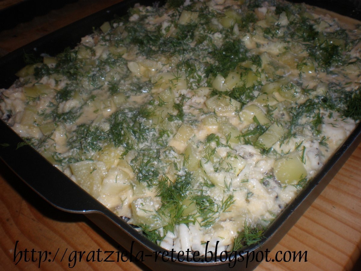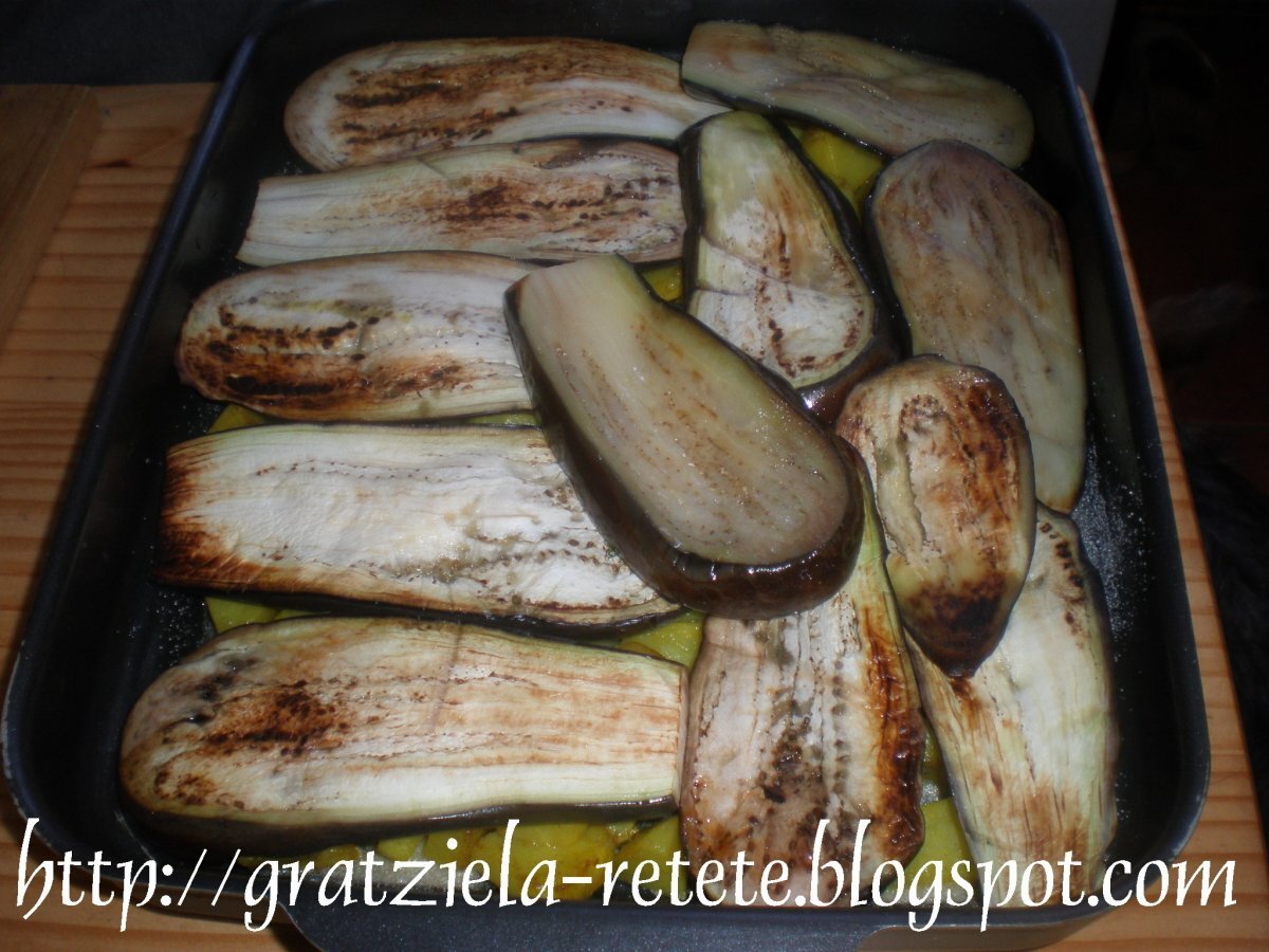Musaca de cartofi si vinete PrecedentulUrmătorul AlteleUșor1 h 50 m Trimite unui prieten Printează pagina Adresează o întrebare autorului Postează o poză cu rețeta gătită de tine Ingrediente 8 Ingrediente: 1/2 kg ciuperci 2 vinete mari 1 ardei gras 1 dovlecel 1 kg cartofi cas afumat 1/2kg ceapa uscata 2 buc. smantana 500gr oua 6 buc. cimbru tarhon marar