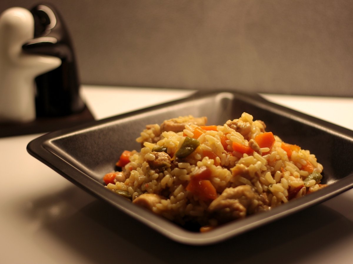 Orez cu pui si legume AlteleFoarte ușor30 min Trimite unui prieten Printează pagina Adresează o întrebare autorului Postează o poză cu rețeta gătită de tine Ingrediente 8 1 ceapa mare 2 morcovi 1 ardei gras 1 rosie mare 3 catei usturoi 300 g orez 500 g carne de pui optional un pumn de mazare ulei,sare