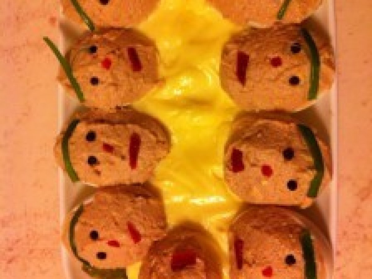 Oua umplute cu pateu AlteleUșor1 oră Trimite unui prieten Printează pagina Adresează o întrebare autorului Postează o poză cu rețeta gătită de tine Ingrediente 1 Ingrediente necesare: 10 oua 200g pateu de porc jumatate de ceapa maioneza sare/vegeta Pentru ornat eu am folosit: boabe de piper ardei iute rosu ardei rosu ceapa verde