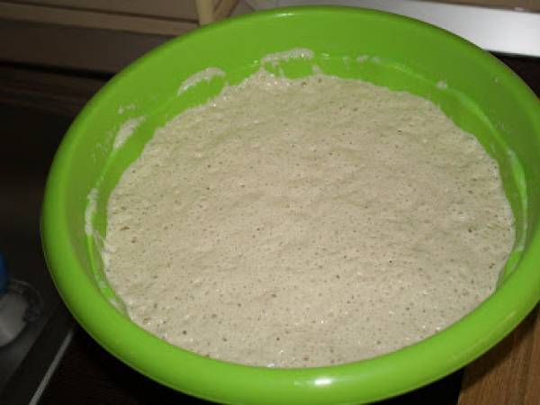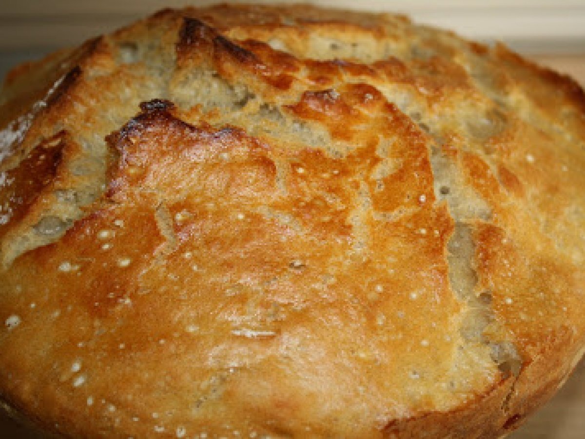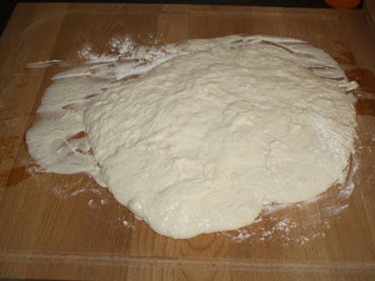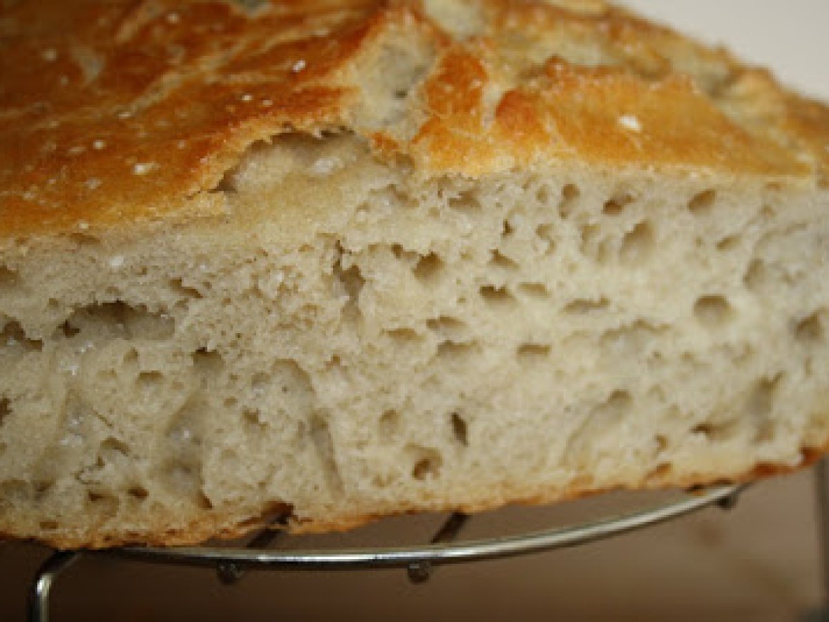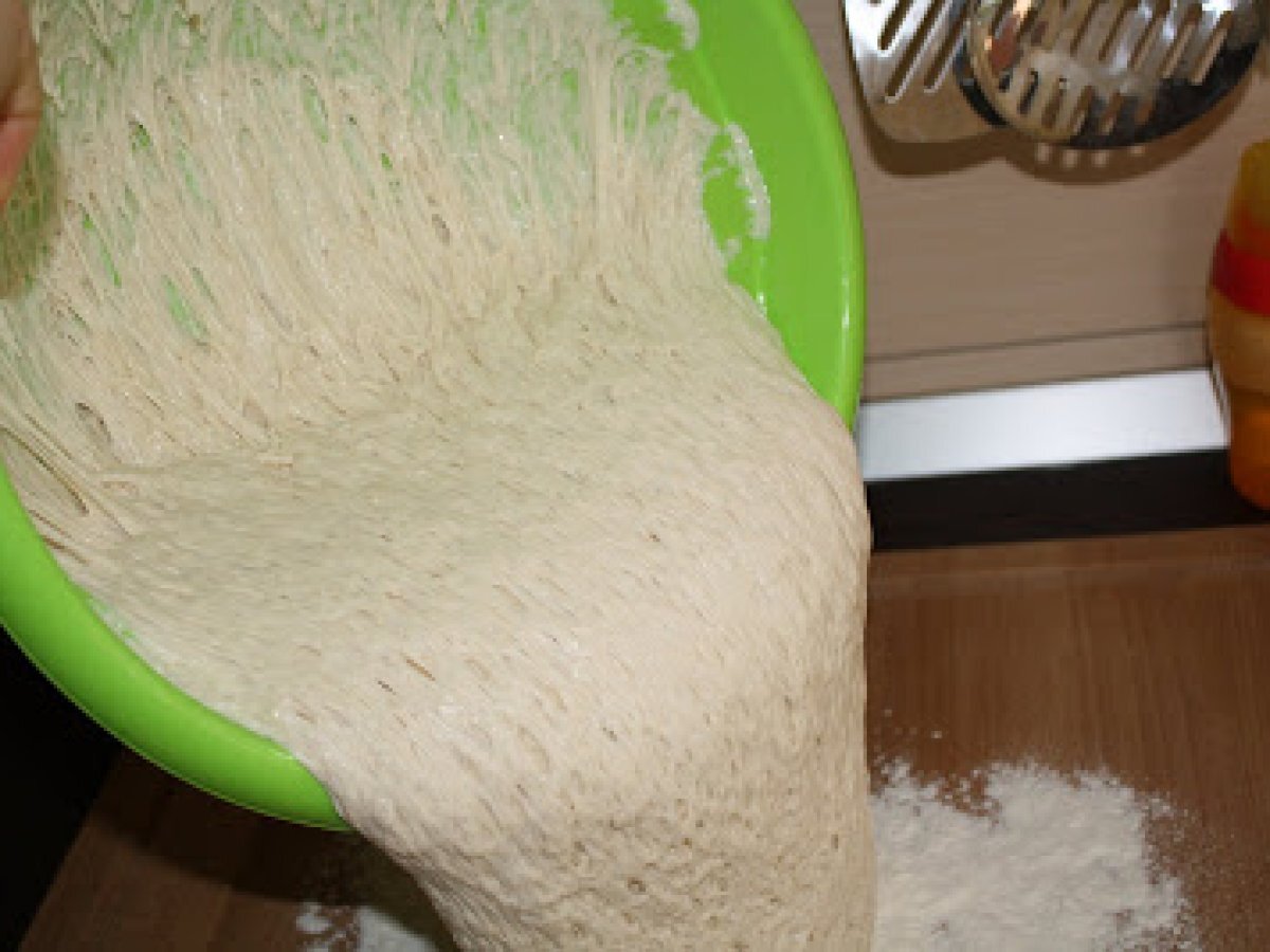 Intr-un vas mare punem faina, sarea si drojdia. Le amestecam bine. Adaugam apoi apa.Si apoi incepem sa amestecam bine compozitia. Se infoliaza vasul cu punga/folie alimentara si se lasa aluatul la dospit 14-30 ore, insa niciodata mai mult de 30 ore.