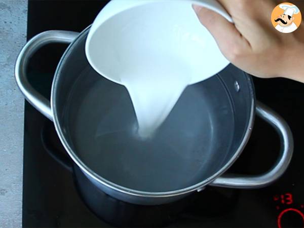 Puneti apa, siropul din trestie de zahar si sarea intr-o oala mare. Amestecati lingura de amidon cu putina apa si adaugati amestec in oala.