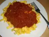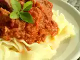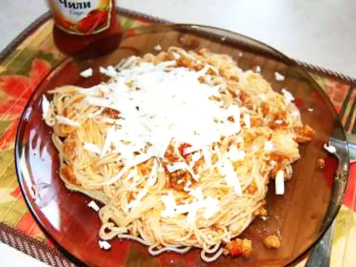Paste de orez cu sos ragu' AlteleUșor1 h 15 m Trimite unui prieten Printează pagina Adresează o întrebare autorului Postează o poză cu rețeta gătită de tine Ingrediente 8 300 gr paste de orez (fidea) 1 ceapa rosie mare 50 ml. ulei de masline 3,4 catei de usturoi potriviti 3 rosii proaspete 150 gr. pasta de rosii 400 gr. carne tocata de vita condimente 50 gr branza de oi