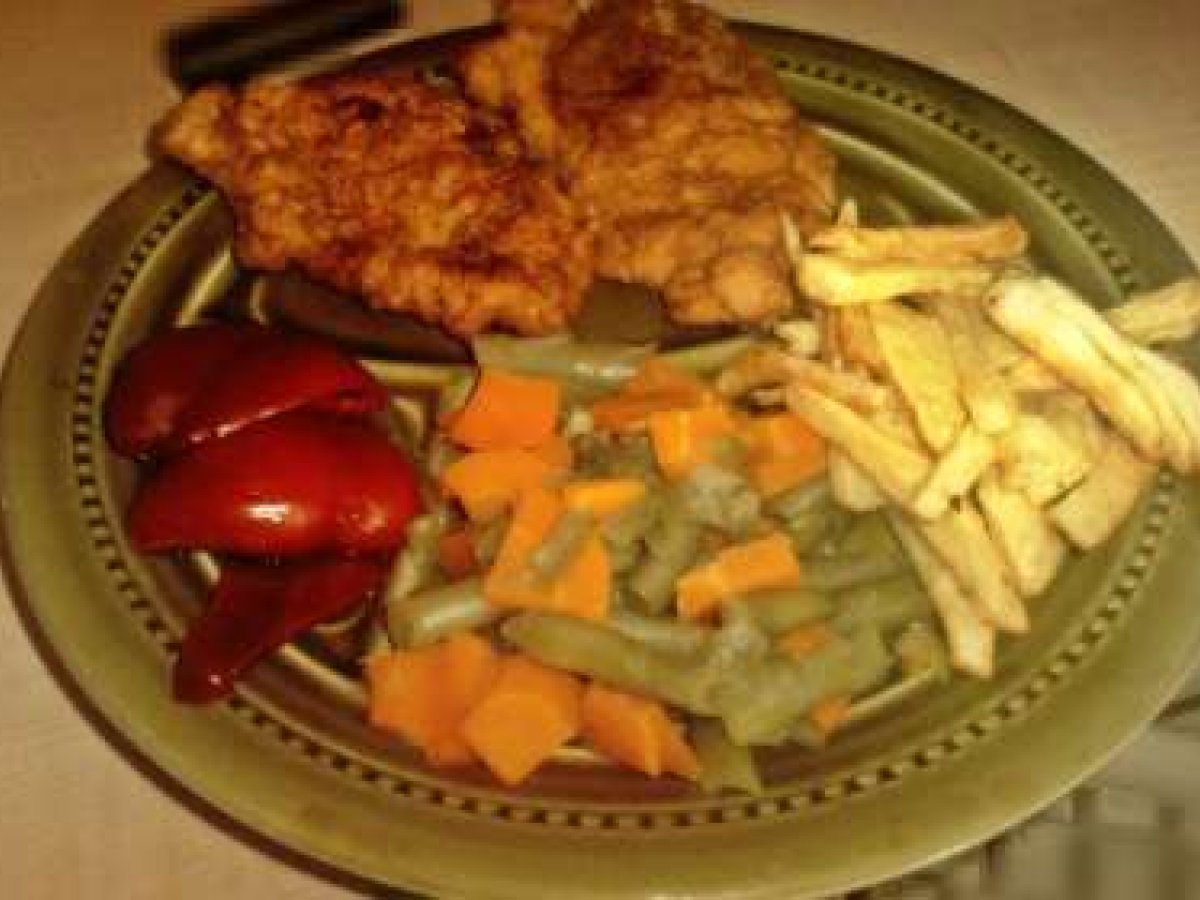 Piept de pui pane cu garnitura de legume si cartofi prajiti AlteleUșor1 oră Trimite unui prieten Printează pagina Adresează o întrebare autorului Postează o poză cu rețeta gătită de tine Ingrediente 8 INGREDIENTE:1 bucata piept de pui,250gr.pastai vidati,2morcovi fierti,5cartofi,100gr.telemea,1ou,putina apa minerala,piper,boia,vegeta,tarhon,sare,faina,2lg.ulei de masline(pt. prajit)