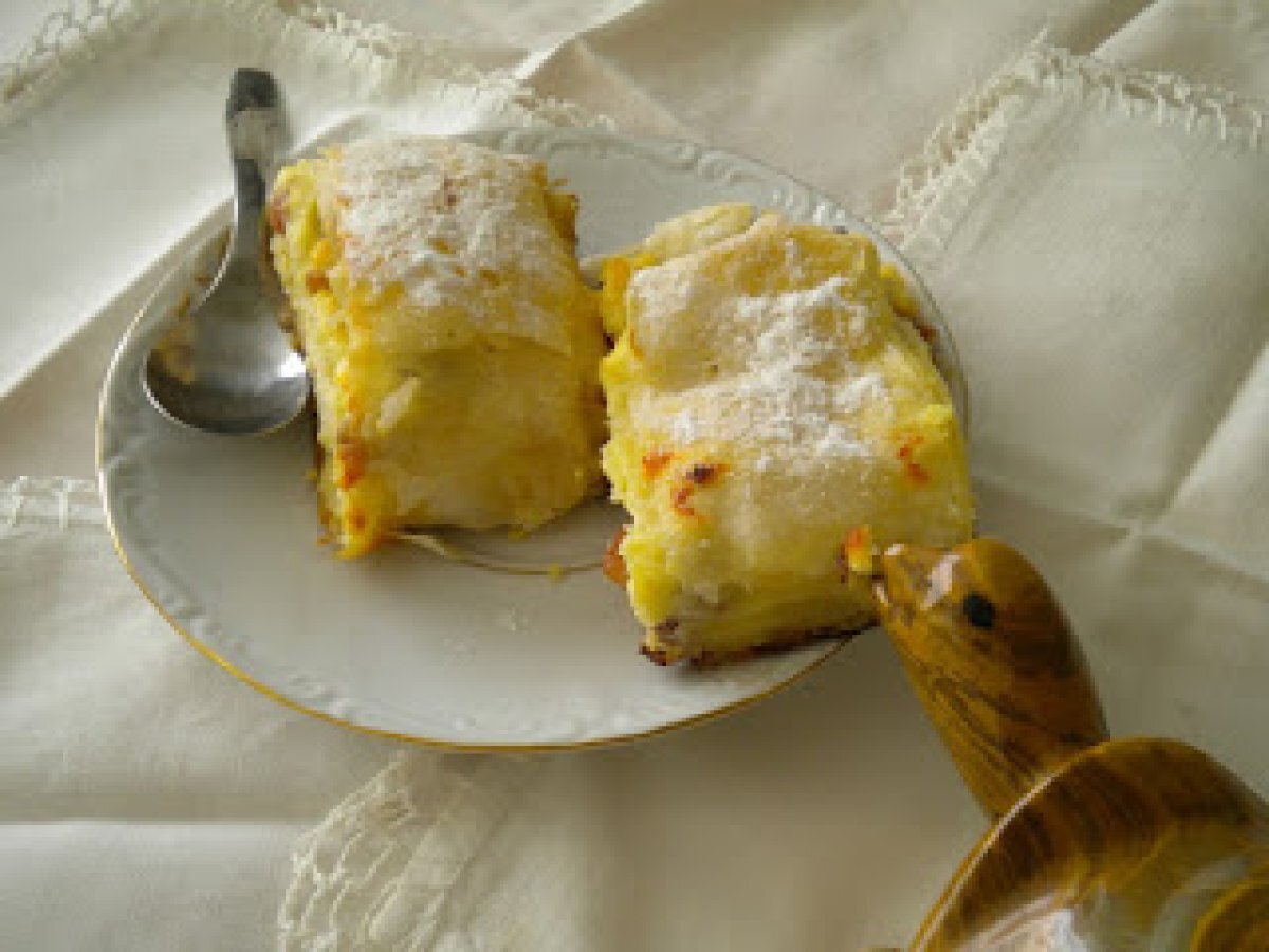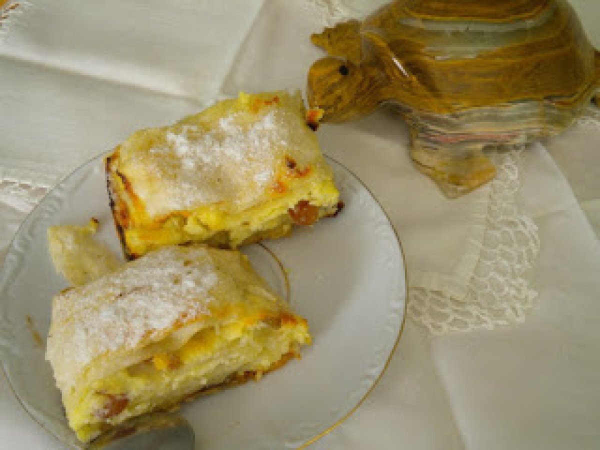 Placinta foietaj cu branza PrecedentulUrmătorul AlteleFoarte ușor40 min Trimite unui prieten Printează pagina Adresează o întrebare autorului Postează o poză cu rețeta gătită de tine Ingrediente 6 un pachet de foi de placinta din comert, un bo de branza de vaci de la piata, de aprox. 5-600 g, 4 oua intregi, 4 linguri pline de zahar, doua maini de stafide, coaja de lamaie si portocala, esenta de rom, zahar vanilat, 100 g unt topit.