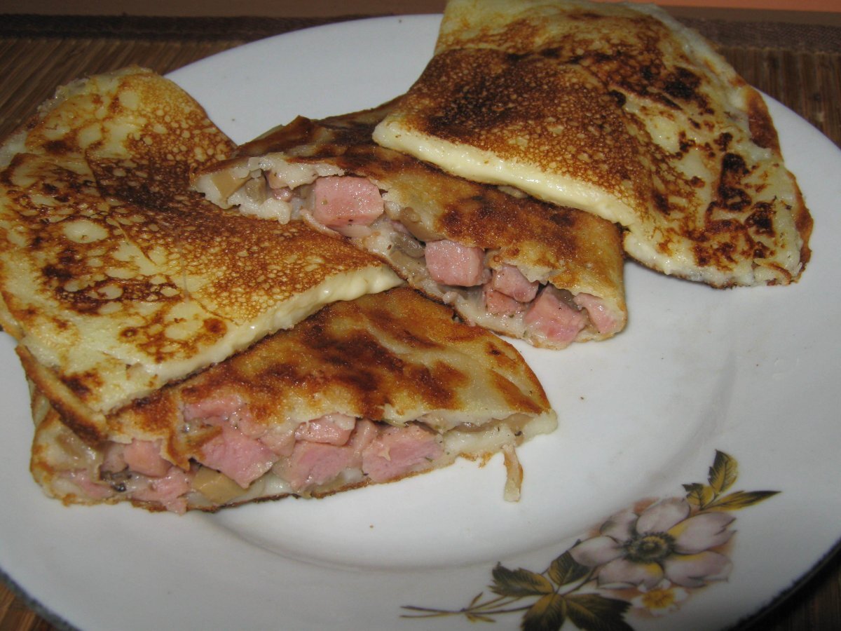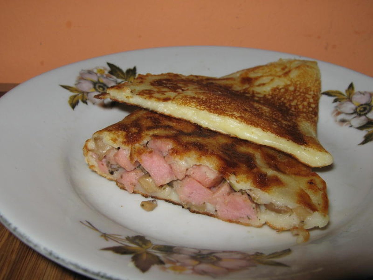 Placinte cu sunca si ciuperci, si cascaval PrecedentulUrmătorul AlteleUșor1 oră Trimite unui prieten Printează pagina Adresează o întrebare autorului Postează o poză cu rețeta gătită de tine Ingrediente 8 2 buc oua 500 ml lapte batut 200 g branza de vaci 1 lingurite bicarbonat de sodiu 250 g faina 0.25 lingurite sare 500 g sunca presata 1 buc ceapa alba o cutie ciuperci conservate 1 lingura patrunjel verde tocat 200 g cascaval