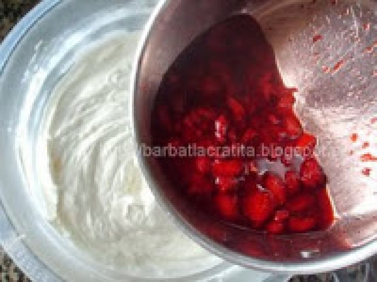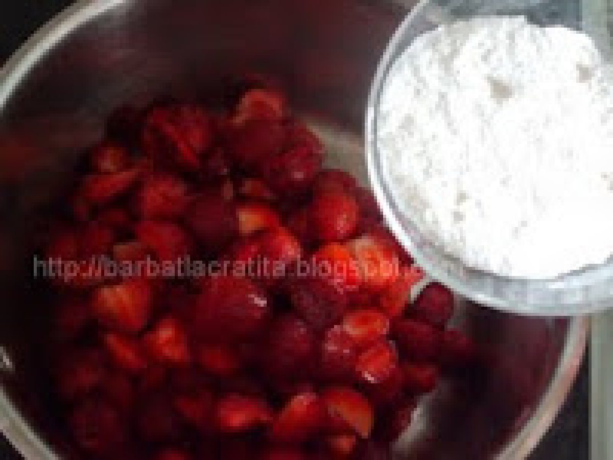 Prajitura cu frisca si capsuni a zeilor PrecedentulUrmătorul AlteleDificil2 zile 18 h Trimite unui prieten Printează pagina Adresează o întrebare autorului Postează o poză cu rețeta gătită de tine foarte buna ADVERTISMENT:doar pentru zei Ingrediente 15 pentru blatul prajiturii: 4 oua 4 linguri zahar 4 linguri faina pentru crema de capsuni si frisca: 500 g capsuni 200 ml frisca 4 linguri zahar o lingurita coaja de lamaie rasa un pliculet gelatina (10 g) pentru glazura prajiturii: un plic tort gelle 2 linguri zahar 250 ml apa