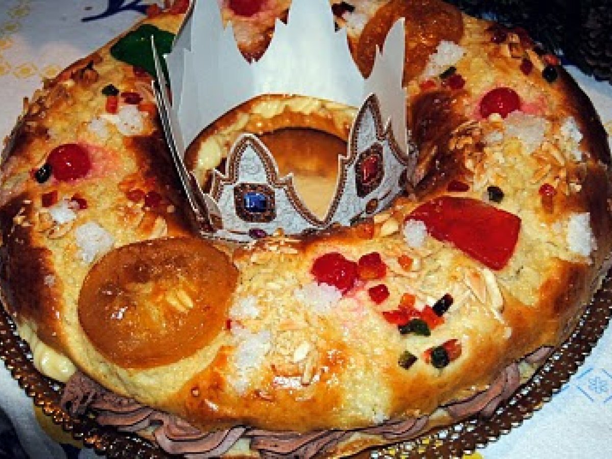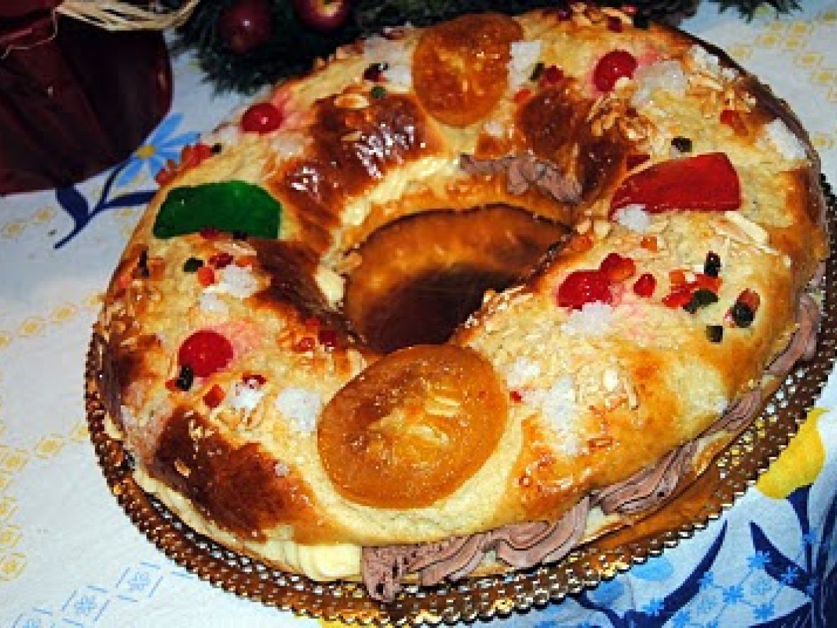 Roscon de reyes PrecedentulUrmătorul AlteleFoarte ușor55 min Trimite unui prieten Printează pagina Adresează o întrebare autorului Postează o poză cu rețeta gătită de tine Ingrediente 8 1 kg faina 300 ml apa calduta 2 oua 60 g unt 250 g zahar 2 linguri miere 3 plicuri drojdie coaja rasa de portocala si lamaie 1 lingutrita rasa de sare apa de flori de portocale Pentru uns deasupra: 1 ou Pentru orant : fructe confitate , migdale, zahar