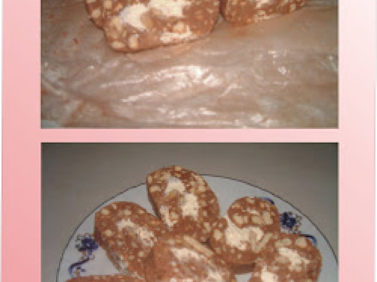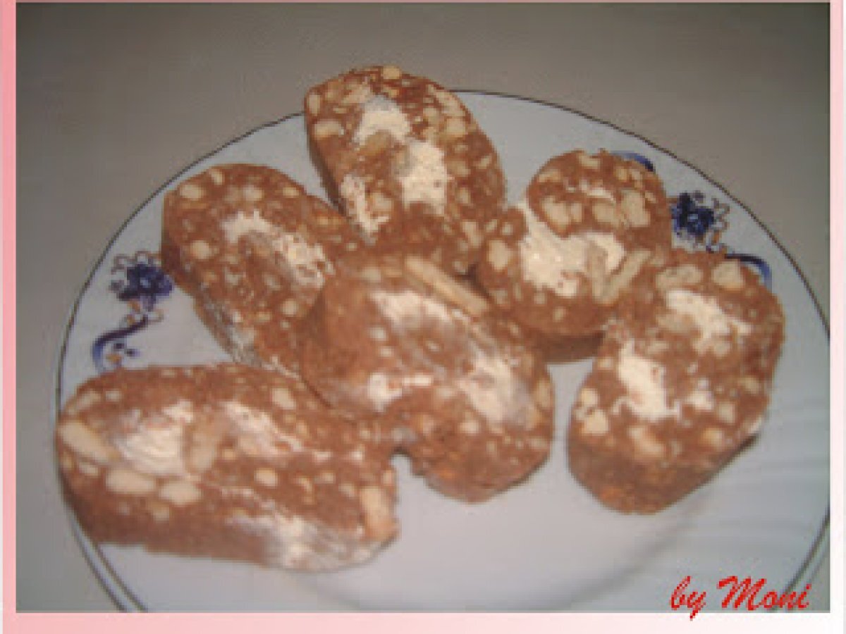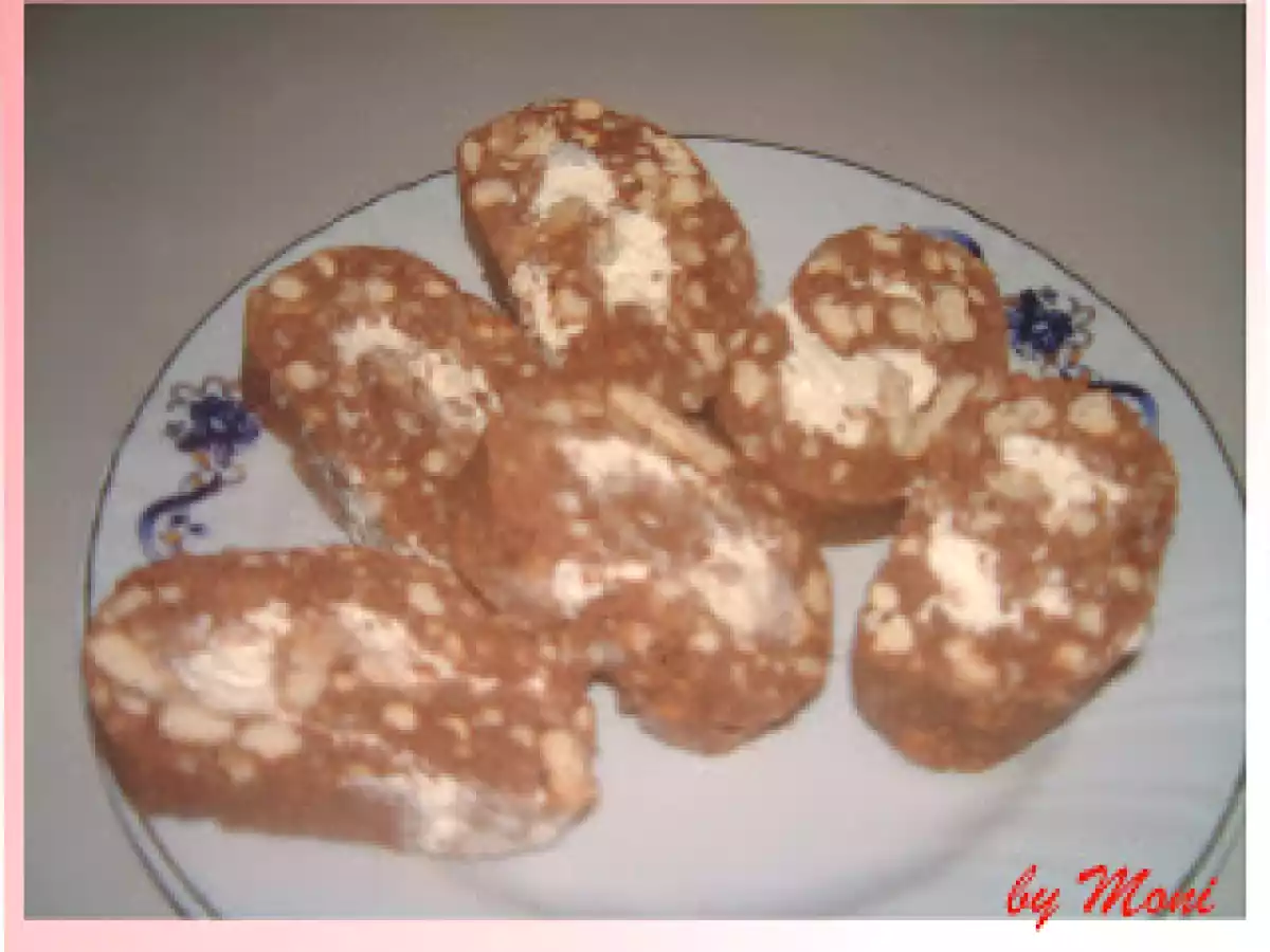 Rulada de biscuiti cu crema de mascarpone PrecedentulUrmătorul AlteleFoarte ușor35 min Trimite unui prieten Printează pagina Adresează o întrebare autorului Postează o poză cu rețeta gătită de tine Ingrediente 4 50 biscuiti populari, 6 linguri zahar, 200 g unt, 2 galbenusuri, jumatate de sticluta de esenta de rom, lapte, 4 lingurite cacao, 125 g mascarpone, 100 ml frisca lichida, un ou, 2 linguri zahar.