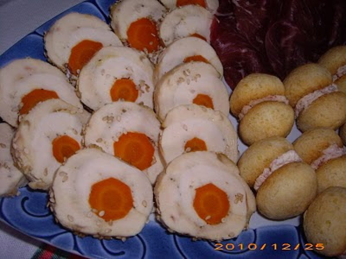 Rulada din piept de pui PrecedentulUrmătorul AlteleFoarte ușor30 min44 Kcal Trimite unui prieten Printează pagina Adresează o întrebare autorului Postează o poză cu rețeta gătită de tine Ingrediente 4 un piept de pui doi morcovi sare piper seminte de susan Cost estimat: 1.48Euros€ (0.37€/porție)