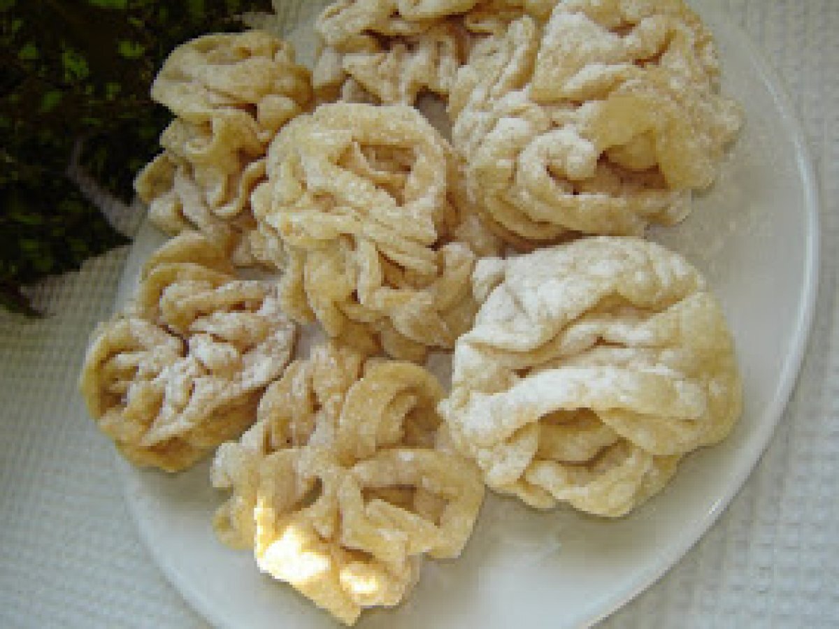 Scovergi AlteleFoarte ușor30 min Trimite unui prieten Printează pagina Adresează o întrebare autorului Postează o poză cu rețeta gătită de tine Ingrediente 5 un ou un praf de sare o lingura de apa faina cat sa iasa un aluat usor de intins zahar pudra 2 strecuratori de aceeasi dimensiune ulei ca pentru cartofi prajit