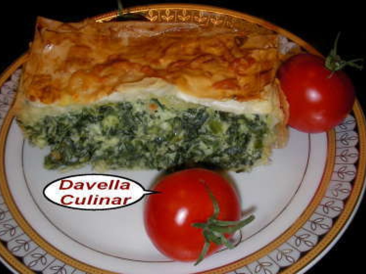 Spanakopita ( placinta cu spanac) PrecedentulUrmătorul AlteleUșor1 h 10 m Trimite unui prieten Printează pagina Adresează o întrebare autorului Postează o poză cu rețeta gătită de tine Ingrediente 8 8 10 foi de foietaj, 300 gr.spanac congelat ( pentru spanac proaspat cca 1 kg. ), 4-5 fire de ceapa verde, 150 gr. branza feta ( tare ), 100 gr. mozzarrella ( optional ), 3 oua ( 2 oua pentru umplutura si 1 ou pentru uns deasupra ), 2-3 linguri smantana grasa, 2 linguri marar tocat, 50 ml. ulei de masline, 50 gr.unt, sare si piper. Observatie: Pentru ca placinta sa va reuseasca este bine sa folositi adevarata branza tip Feta greceasca.
