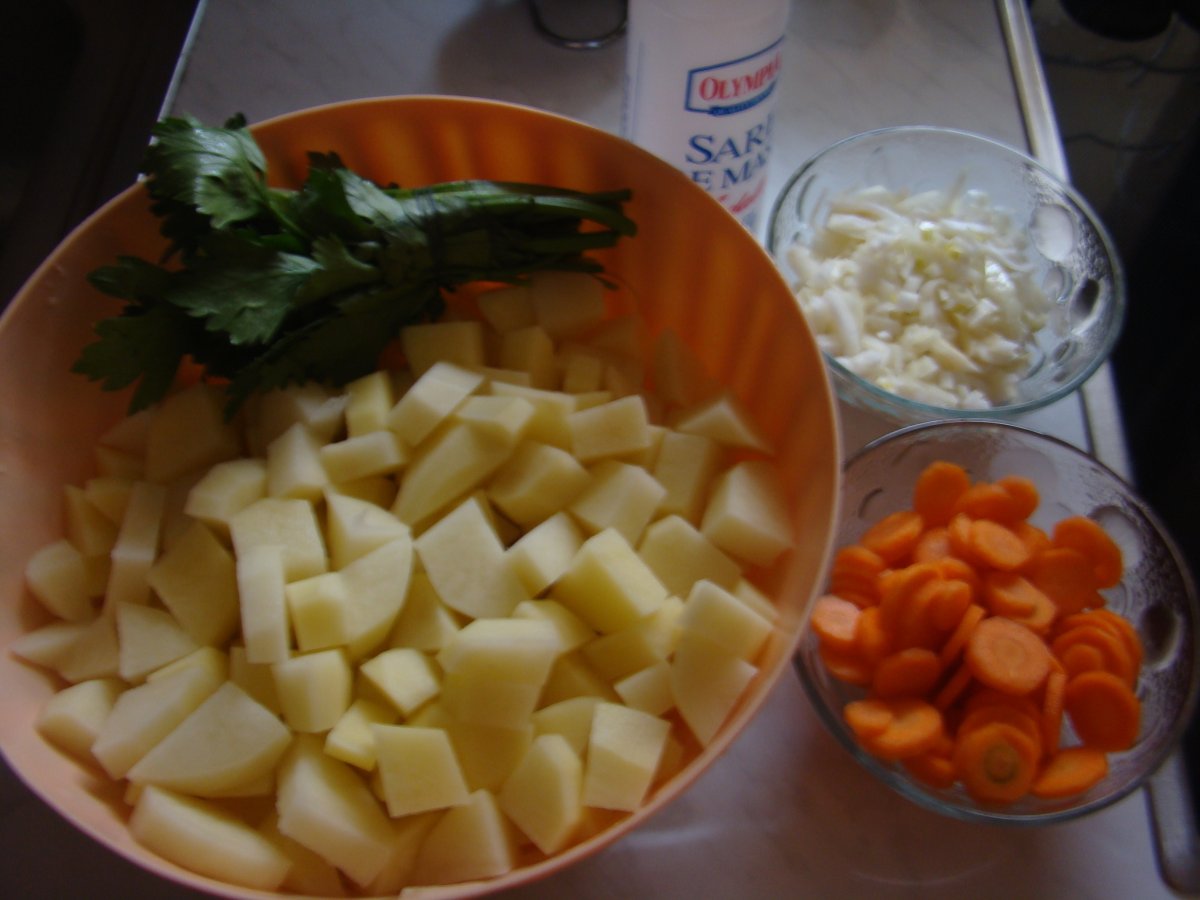 Supa de cartofi noi PrecedentulUrmătorul AlteleFoarte ușor35 min Trimite unui prieten Printează pagina Adresează o întrebare autorului Postează o poză cu rețeta gătită de tine Ingrediente 6 Avem nevoie de: 1-1,5 kg cartofi noi 1 legatura de zarzavat nou 1 ceapa uscata mare 1 ardei gras 100g rosii pasta rustica 300 g smantana peste 30% grasaime sau frisca pentru gatit 1 legatura de frunze de telina si patrunjel verde 1 legatura de leustean sare 50 ml ulei 2 linguri rase de faina alba 1 lingurita boia de ardei