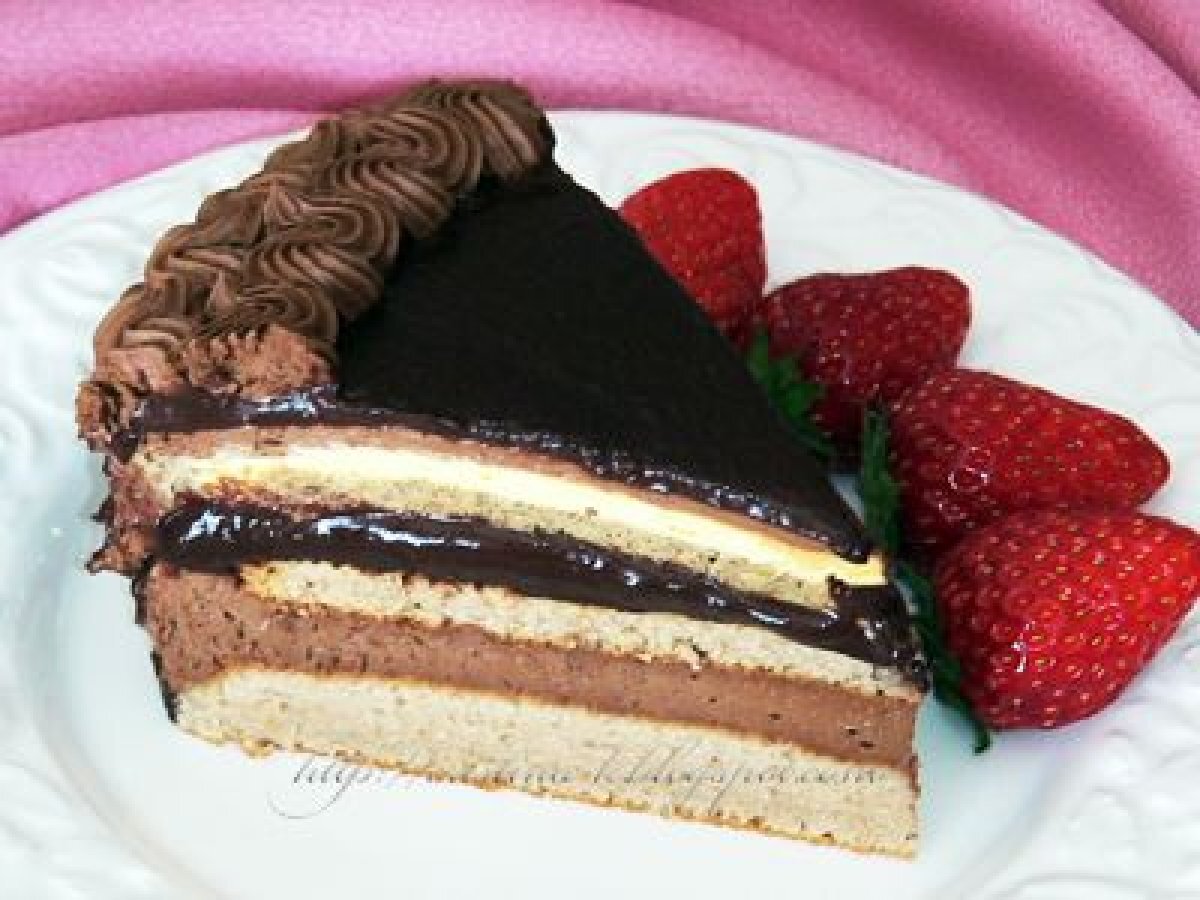 Tort dolce vita PrecedentulUrmătorul AlteleFoarte ușor1 h 25 m Trimite unui prieten Printează pagina Adresează o întrebare autorului Postează o poză cu rețeta gătită de tine Aceasta combinatie de gusturi si arome mi s-a parut perfecta pentru un tort aniversar. Ingrediente 4 Blat "picant" : 5 albusuri (aprox. 190g) un praf de sare 40 g zahar 140 g pudra de migdale sau migdale decojite macinate fin 20 g faina 1 lingurita rasa scortisoara 1/4 lingurita piper negru pudra 1/3 lingurita piper roz pudra sau putina pudra de ardei iute Ganache cu zmeura : 150 g piure de zmeura 150 g mizuame (sirop de orez) sau corn-syrup sau glucoza (sirop) 100 ml lapte 250 g ciocolata amaruie (70% cacao) Freeze 300 g zmeura : După decongelare piure blender și după ce trece printr-o sită dat must aproximativ 200 g, cu unele semințe în ea. Bavareza de vanilie : 120 ml lapte 3 g albenusuri 40 g zahar 2 g agar-agar sau 4~5 g gelatina (pudra) 150 ml smantana dulce pt. frisca Crema cu anason si cafea : 1/3 din cantitatea totala de bavareza de vanilie 1 lingura cafea pt. espresso - trecuta printr-o strecuratoare de ceai 1 lingura seminte de anason 3 linguri brandy Mousse de ciocolata : 50 g zahar 100 ml lapte 20 g mizuame (sirop de orez) sau corn-syrup sau glucoza (sirop) 6 g albenusuri (90~100 g) 250 g ciocolata amaruie (70% cacao) 450 ml smantana dulce pt. frisca Decor : 1/2 ganache cu zmeura mousse de ciocolata