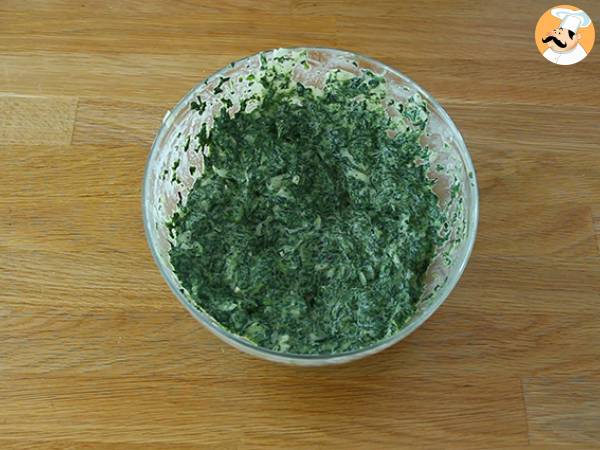 Adaugati spanacul tocat si ceapa maruntita fin si amestecati bine.